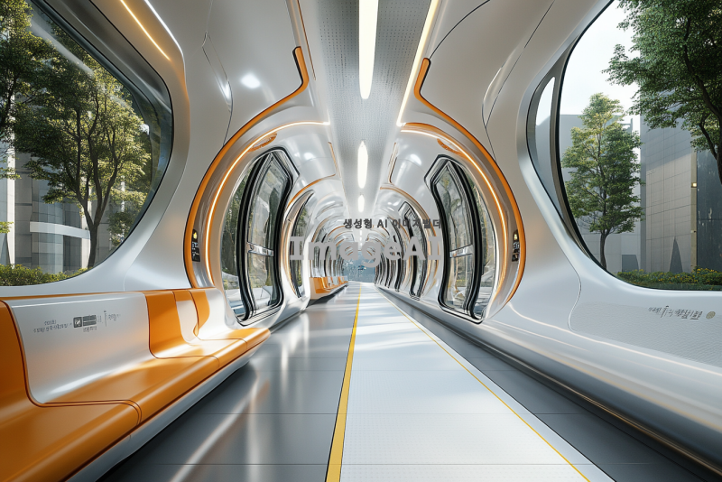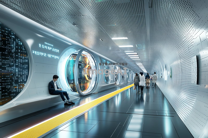 미래의 지하철 내부와 외부 모습, 첨단 기술이 접목된 디자인, 유리와 금속 소재로 이루어진 구조, 다양한 인공지능 안내 시스템, 고속 이동을 위한 레일, 승객들이 편안하게 앉아 있는 모습, 역사적인 요소가 가미된 장식, 조명은 부드럽고 현대적인 느낌, 미래 도시 풍경과 어우러진 모습, 한국의 전통적인 요소와 현대적 디자인이 조화를 이루는 지하철역.