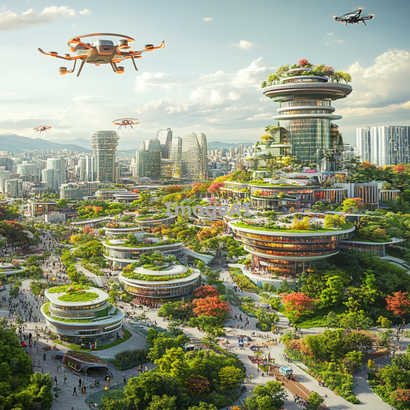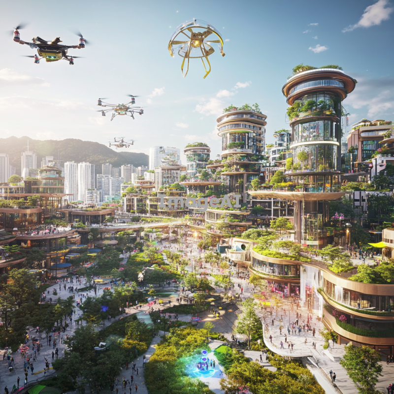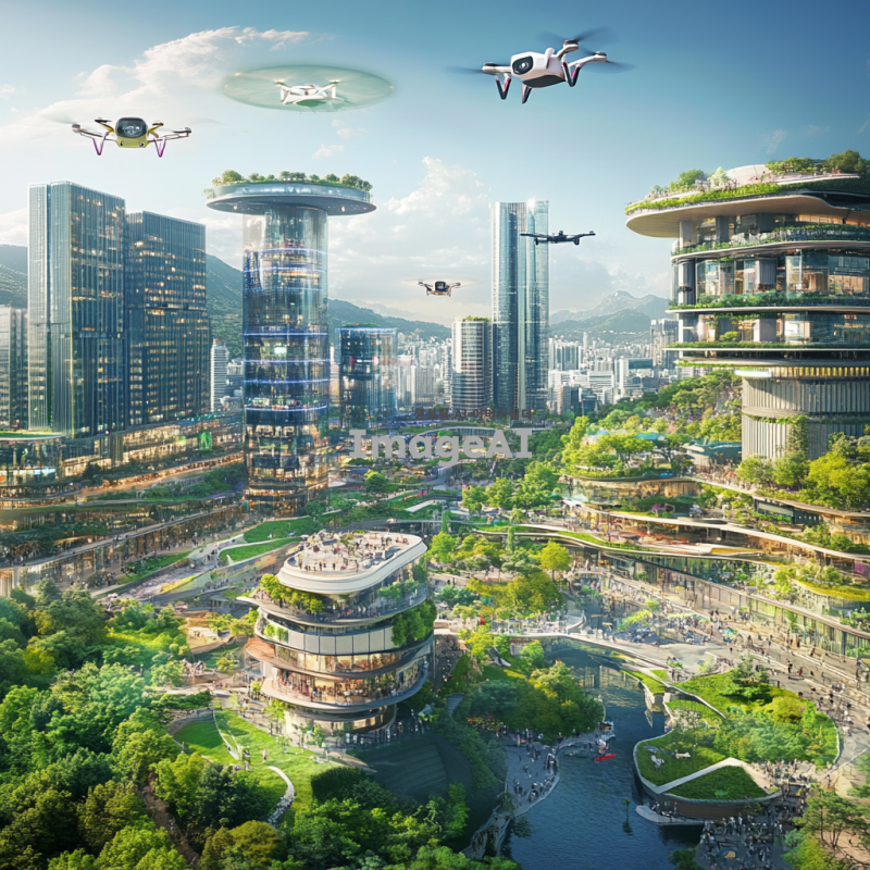 미래의 도시 풍경, 첨단 기술이 접목된 모습, 다양한 사람들과 문화가 어우러진 장면, 푸른 자연과 조화롭게 공존하는 건축물, 하늘을 나는 드론과 스마트 교통수단, 희망찬 분위기, 한국의 전통 요소가 현대적으로 재해석된 모습, 밝고 생동감 넘치는 색감, 미래 지향적인 디자인.