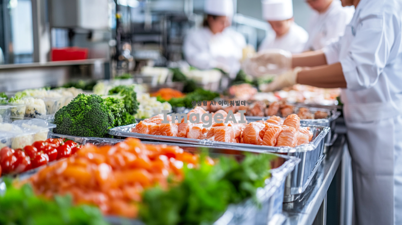 깨끗한 대규모 공장에서 제철 채소와 해산물을 포장하는 모습, 안전복을 입고 작업하는 직원들이 보이며, 공정이 원활하게 진행되고 있는 환경, 밝고 깨끗한 작업 공간, 현대적인 설비와 포장 기계가 조화를 이루는 모습, 해외 수출을 위한 포장 작업의 전문성과 효율성이 강조된 이미지.