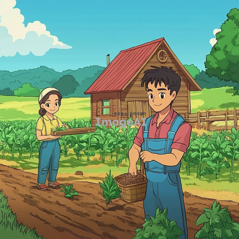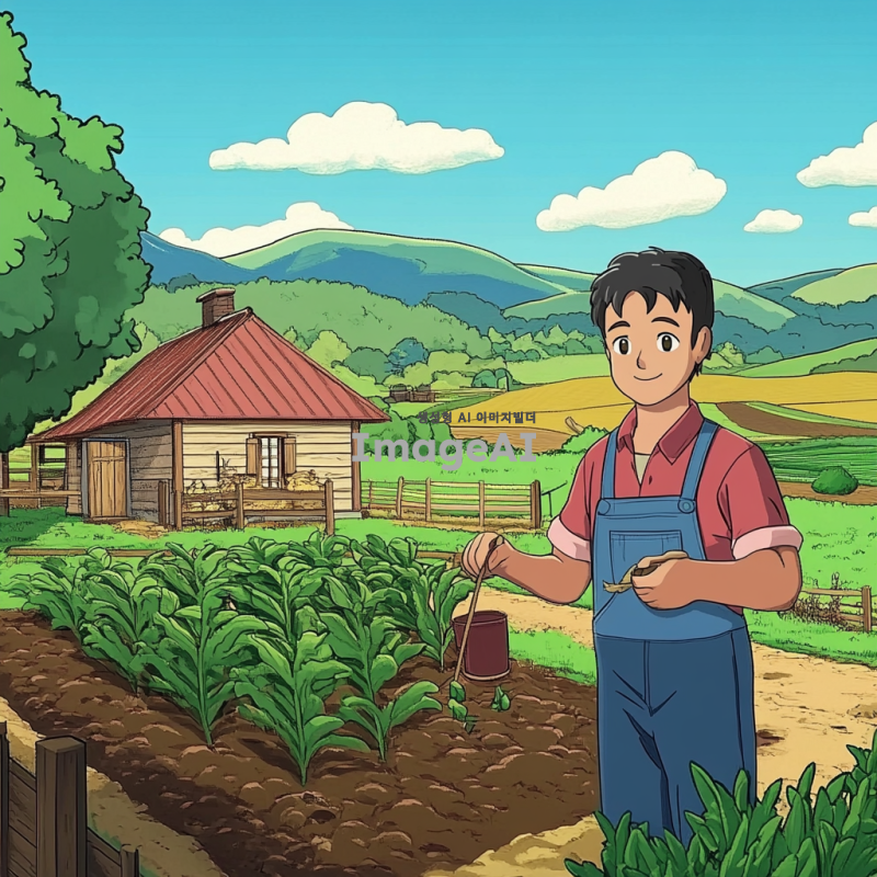 멀리서 농사를 짓고 있는 농부 3~4명을 표현하되, 한명은 첨부한 이미지와 똑같은 사라을 사용해야합니다