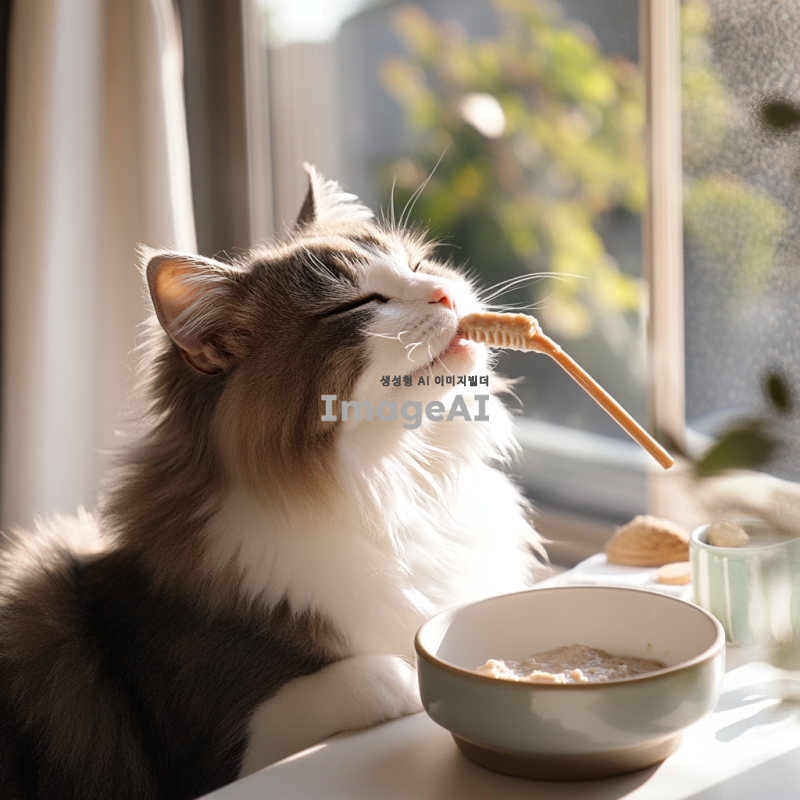 사료를 먹고 있는 한국 고양이가 그릇에 담긴 사료를 맛있게 먹고 있는 장면, 주변에는 아기자기한 장난감들이 놓여 있어 귀여운 분위기를 연출.