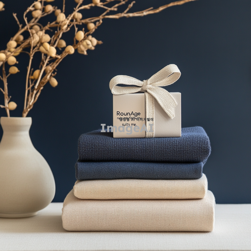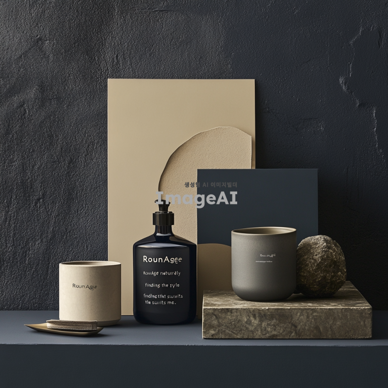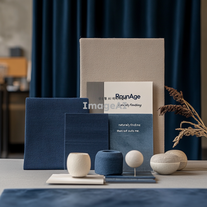 고급스럽고 자연스러운 세련됨을 표현한 컬러 팔레트를 배경으로, 신뢰감과 안정감을 주는 클래식한 느낌의 딥 네이비와 부드럽고 따뜻한 감성을 지닌 웜 베이지를 조화롭게 배치한 이미지. "RounAge"라는 브랜드 이름이 하나의 흐름처럼 연결된 형태로, 세리프 계열 폰트를 사용하여 클래식하면서도 현대적인 감각을 유지하는 로고 디자인. 감각적이고 신뢰감 있는 큐레이션 전문가의 느낌을 강조하며, "자연스럽게 나에게 맞는 스타일을 찾는다"는 메시지를 전달하는 공간의 이미지. 모던과 클래식의 조화가 잘 드러나고, 세련된 무드를 가진 스타일을 찾는 공간을 표현.