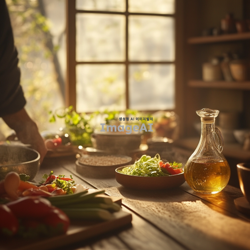 한국 전통 주방에서 참기름을 사용하는 모습, 고소한 향이 나는 참기름 병이 식탁 위에 놓여 있고, 주변에는 신선한 채소와 함께 요리하는 손길이 보인다. 자연광이 들어오는 창가에서 따뜻한 분위기가 느껴지며, 참기름이 담긴 유리병의 세밀한 질감과 색상이 강조된 장면.