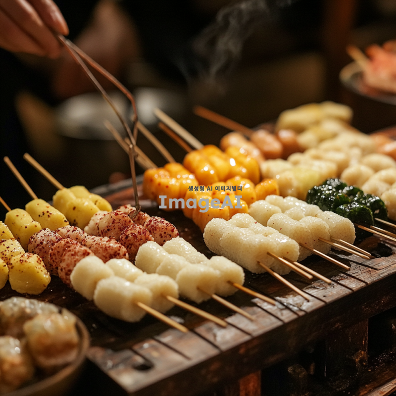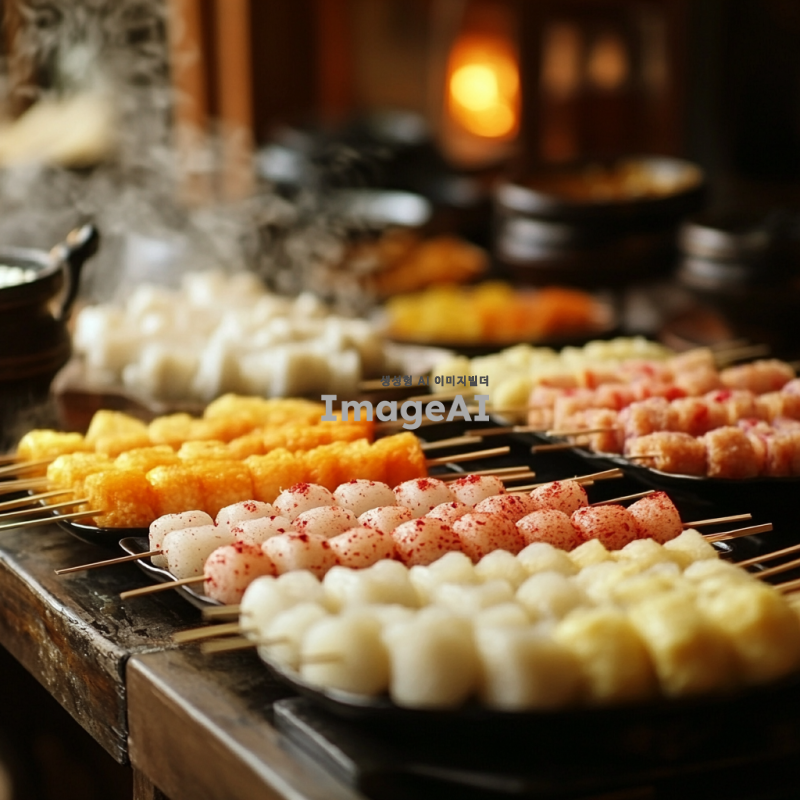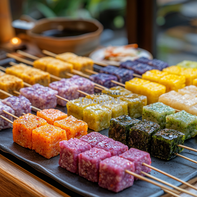 한국 전통 떡을 꼬치에 끼우는 모습, 다양한 색상의 떡이 정갈하게 배열되어 있는 모습, 손으로 꼬치에 떡을 조심스럽게 끼우는 장면, 부드럽고 촉촉한 떡의 질감, 따뜻한 조명 아래에서 촬영된 자연스러운 분위기, 배경에는 전통적인 한국식 테이블과 소품이 있는 장면