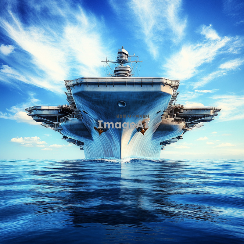 정중앙에 4개의 활주로가 있는 거대 항공모함의 함교를 중심으로, 양쪽에 약간의 공간을 두고 각각 2개의 활주로가 평행하게 배열된 모습. 항공모함의 세부적인 디자인은 현대적이고 강력한 느낌을 주며, 바다 위에서 항해 중인 모습. 주변에는 푸른 하늘과 함께 구름이 흘러가고, 항공모함의 표면은 세련된 색상으로 도색되어 있는 장면.
