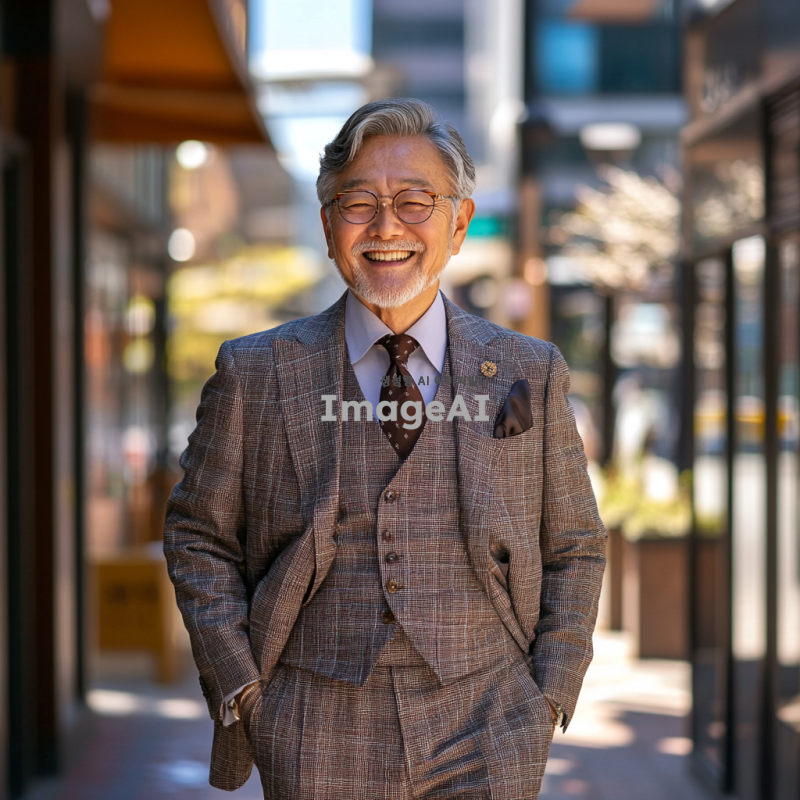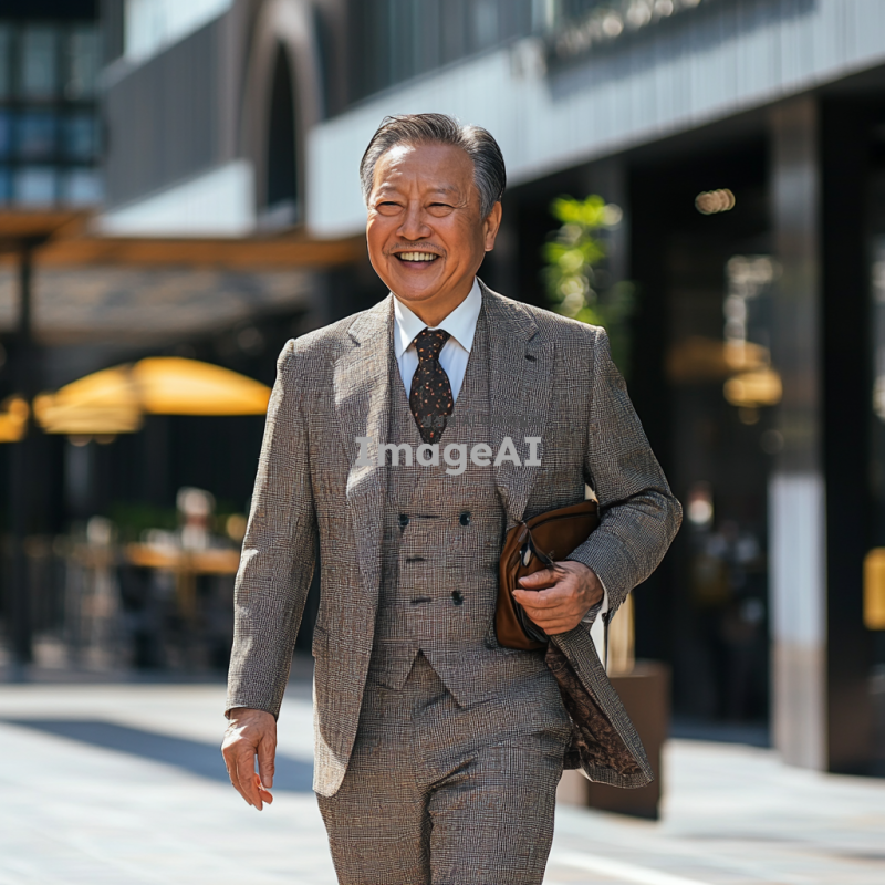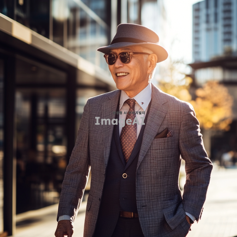 활기차고 세련된 스타일의 한국인 시니어 남성이 고급스러운 정장을 입고 도시의 현대적인 풍경 속에서 여유롭게 산책하는 모습, 밝은 햇살 아래에서 미소를 짓고 있는 모습, 럭셔리한 액세서리와 함께 세련된 분위기를 강조, 배경은 고급 레스토랑과 고층 빌딩이 어우러진 도심 풍경.