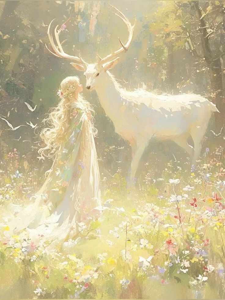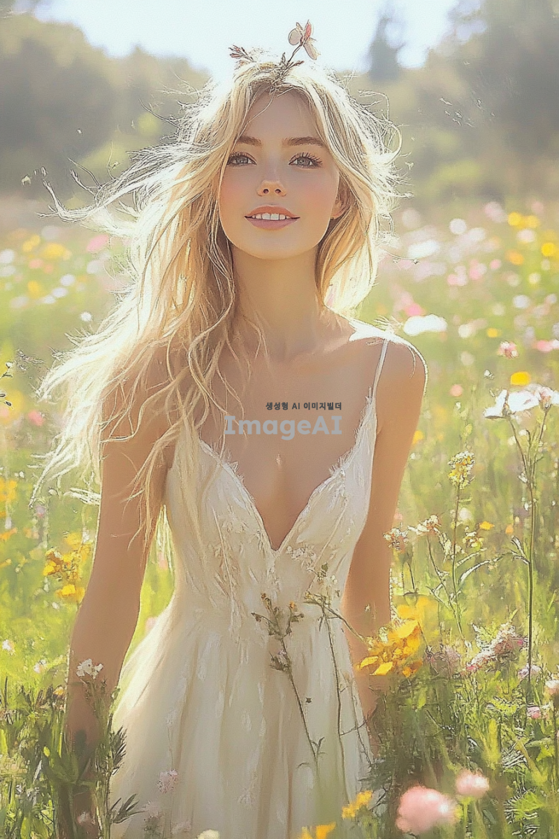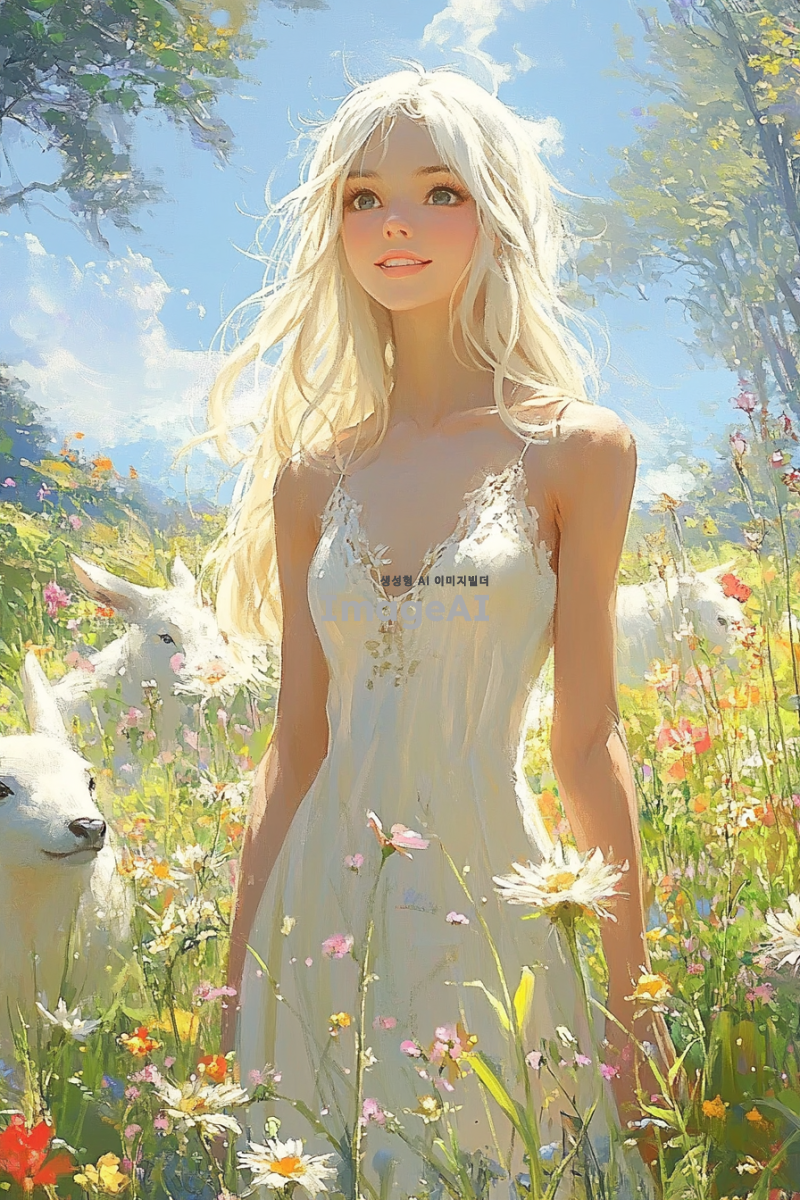 백금발 머리를 가진 영국 소녀가 환한 미소를 지으며 꽃밭에 서 있는 모습. 배경은 화창한 날씨의 파란 하늘과 다채로운 꽃들이 만개한 풍경으로, 소녀의 옷은 하얀 드레스이며, 푸른 숲이 우거진 숲속에 서있는 장면.