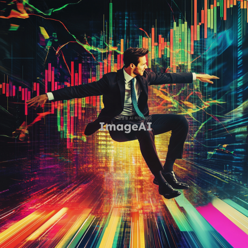 주식차트 위에서 불나방처럼 날아오르는 남성, 불장에 뛰어드는 모습, 차트의 상승세를 상징하는 화려한 색감과 역동적인 배경, 한국의 주식 시장을 배경으로 한 현대적인 분위기, 남성은 스마트한 비즈니스 복장을 하고 있으며 자신감 넘치는 표정으로 차트를 응시하고 있음.