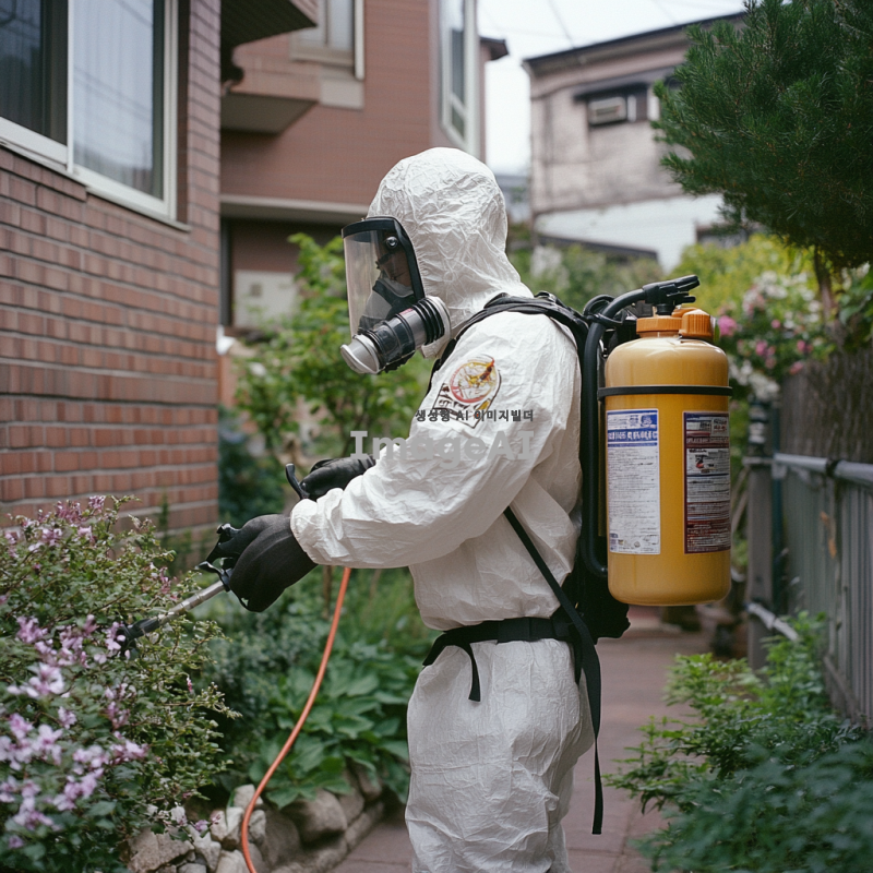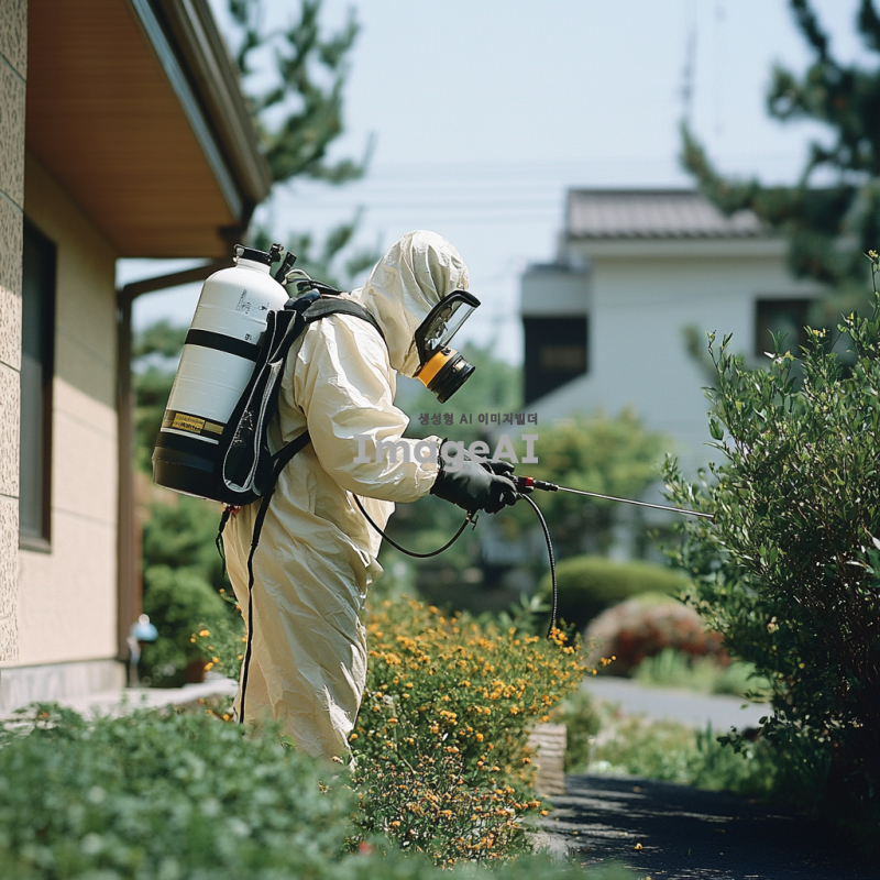 한국의 주택가에서 바퀴벌레, 개미, 모기를 잡기 위한 살충제 방역작업을 진행하는 모습. 전문 방역 직원이 방역 장비를 사용하여 주택 주변에서 작업하는 장면. 주택의 정원과 주변 환경이 잘 보이도록, 방역 약제가 분사되는 모습과 함께 방역 직원의 안전 장비가 강조됨. 맑은 날씨 속에서 방역 작업의 전문성과 신뢰성을 느낄 수 있는 이미지.