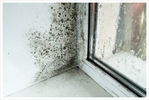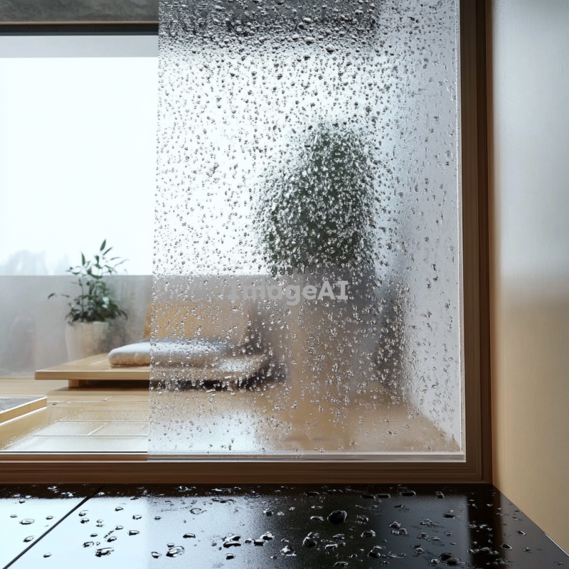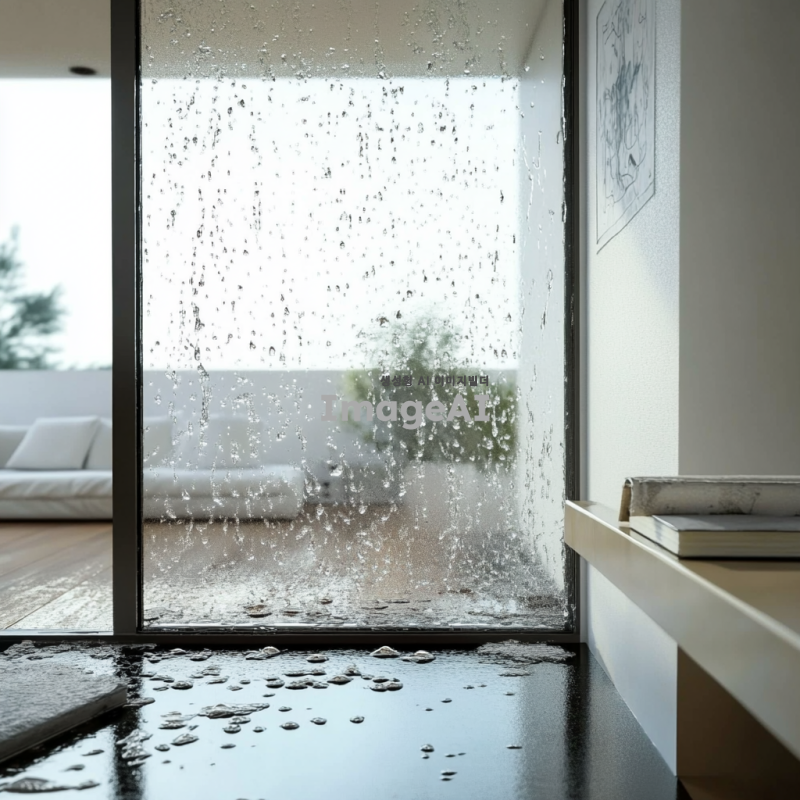 아파트의 결로 문제를 보여주는 실내 장면, 벽에 물방울이 맺힌 모습, 바닥에 물기가 고인 모습, 창문 주변에 결로가 심하게 발생한 상황, 자연광이 들어오는 밝은 분위기, 한국의 현대 아파트 인테리어 디자인, 문제의 심각성을 강조하는 디테일한 표현.