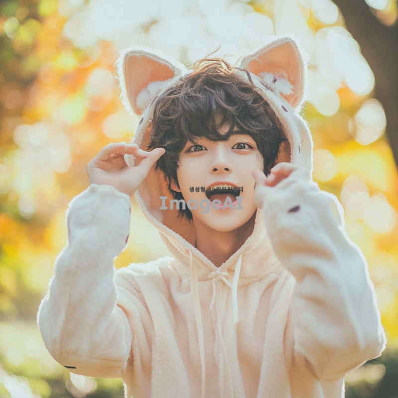 귀여운 고양이 귀와 꼬리를 가진 15세 한국 남성, 밝은 표정과 활기찬 포즈, 자연광 아래에서 놀고 있는 모습, 귀여운 고양이 의상과 액세서리, 배경은 화창한 공원, 아기자기한 느낌의 색감
