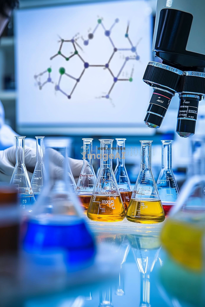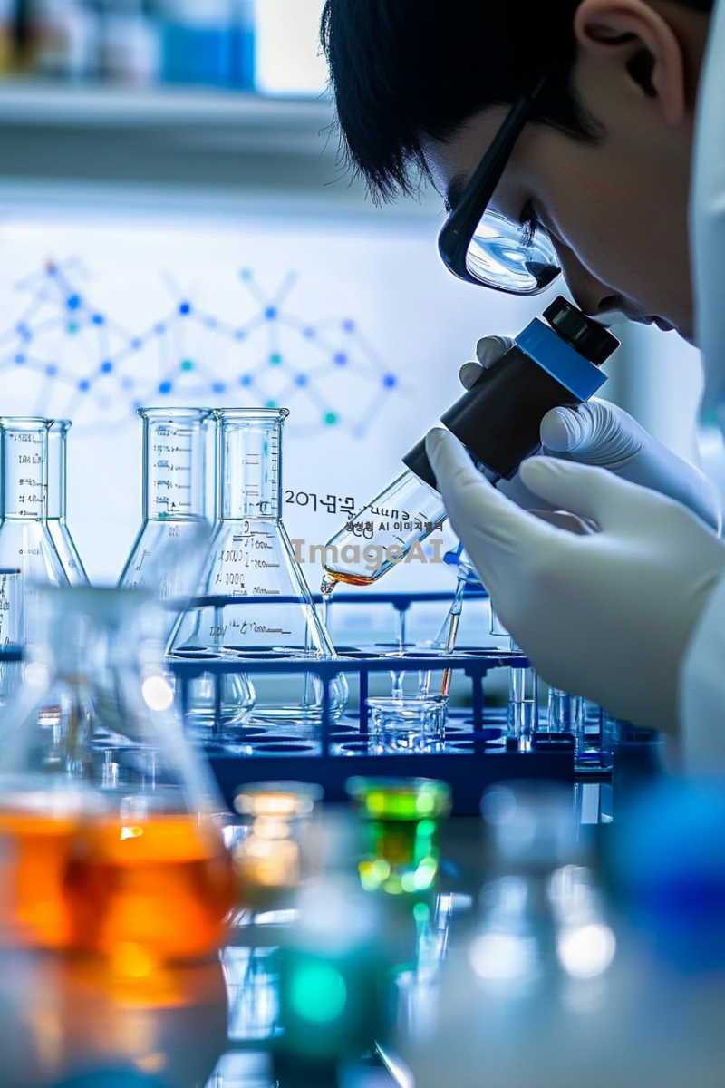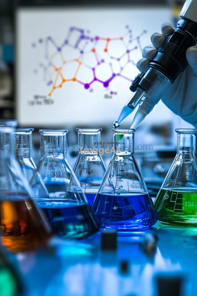 화학 실험실에서 다양한 화학 물질이 담긴 플라스크와 비커가 배열된 모습, 실험복을 입은 한국인 과학자가 흰색 장갑을 끼고 실험에 집중하는 장면, 배경에는 화학 공식과 구조식이 적힌 화이트보드가 보이며, 조명이 밝고 현대적인 느낌의 실험실 환경, 다양한 색상의 액체가 담긴 용기가 강조된 이미지.