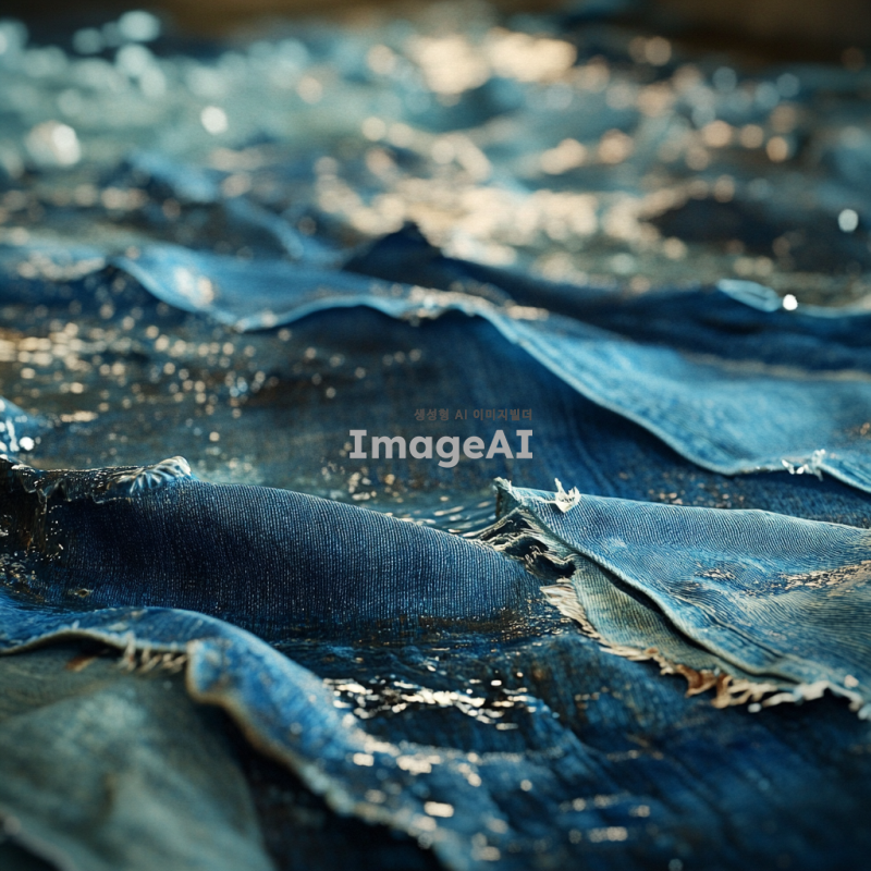 물에 셀비지데님을 담근 사진을 만들어줘. 셀비지데님의 물이 빠져서 물 색이 파란색이였음 좋겠어.