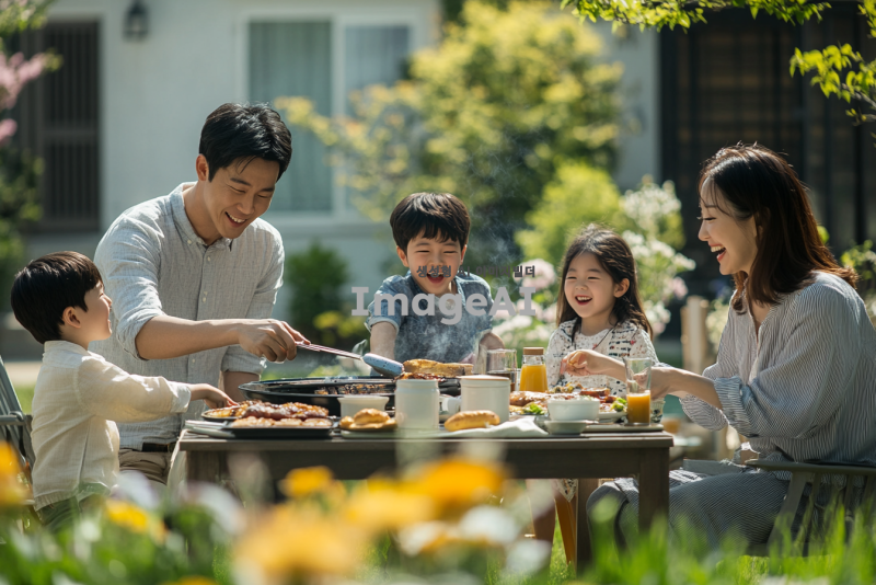 정원에서 한국의 오뚜기 제품을 사용하며 즐거운 시간을 보내고 있는 화목한 가족의 모습. 가족 구성원은 모두 한국인으로, 아버지와 어머니는 바비큐를 굽고 있고, 아이들은 주변에서 놀고 있는 장면. 화창한 날씨 속에서 푸른 잔디와 꽃들로 가득한 정원, 오뚜기 제품이 테이블 위에 놓여 있는 모습. 가족의 웃음과 따뜻한 분위기가 느껴지는 장면.