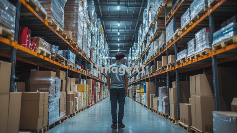 물류창고 내부, 한국인 남성이 상품을 검수하고 있는 모습. 주변에는 다양한 박스와 물품들이 정리되어 있으며, 밝은 조명 아래에서 일하는 분위기. 남성은 작업복을 입고 있으며, 집중한 표정으로 상품을 체크하고 있는 장면. 물류창고의 선반과 물품들이 잘 보이도록 구성.