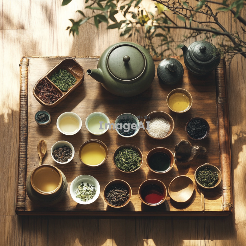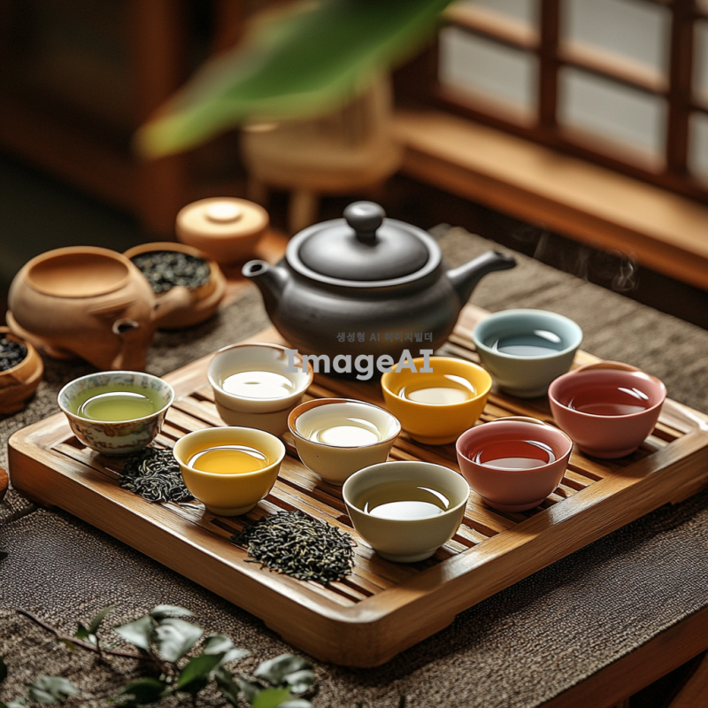 자사호에 담긴 다양한 종류의 차를 세팅한 이미지. 녹차, 백차, 청차, 황차, 흑차, 홍차를 각각 아름답게 담아낸 자사호와 차잔, 차주전자, 차도구들을 배치. 자연광이 비치는 아늑한 차실에서 차의 색감과 질감을 강조하며, 전통적인 한국의 차 문화를 반영한 요소들이 포함된 장면. 차 잎과 찻잔 주변에 차와 관련된 소품들이 자연스럽게 각각 배치되어 있는 모습.