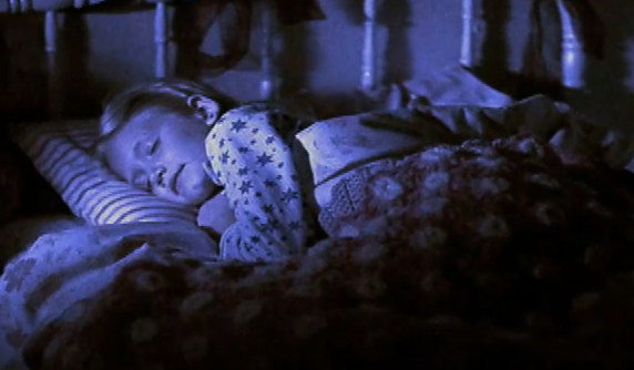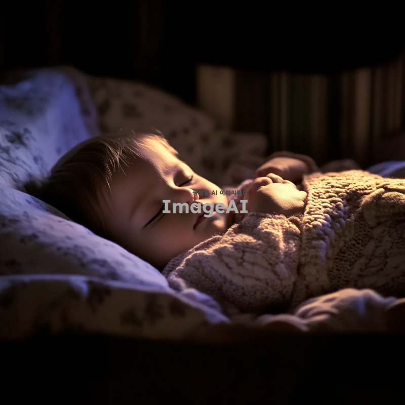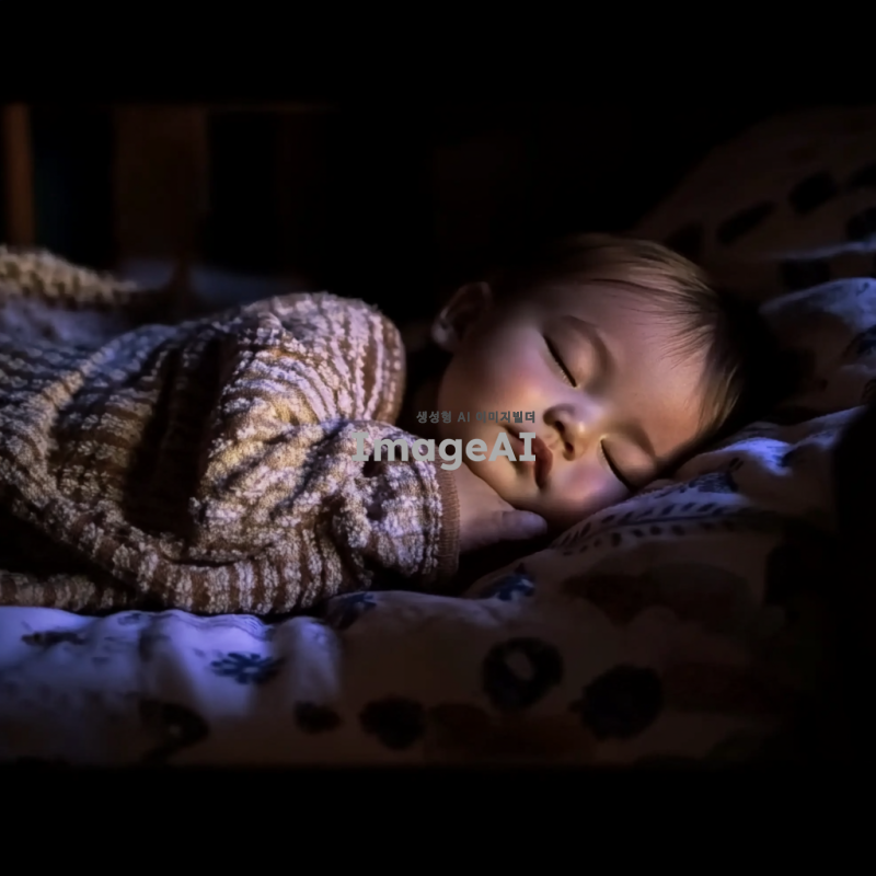 어두운 방 안에서 편안하게 잠든 동양 아기, 평화로운 꿈을 꾼다. 잠든 아기는 옆으로 누워서 이불을 감싸고 있다.