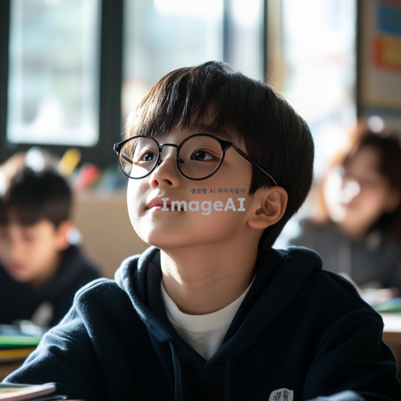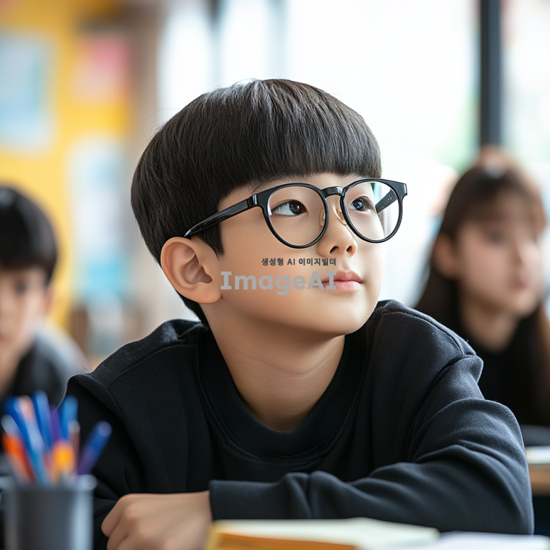 검은색 안경을 쓰고 바가지머리를 한 한국의 6학년 남학생. 밝은 표정으로 교실에 앉아 있으며, 책상 위에는 학용품과 교과서가 놓여 있다. 주변에는 친구들이 함께 공부하는 모습이 보인다. 자연광이 들어오는 창가 근처에서 공부하는 모습.