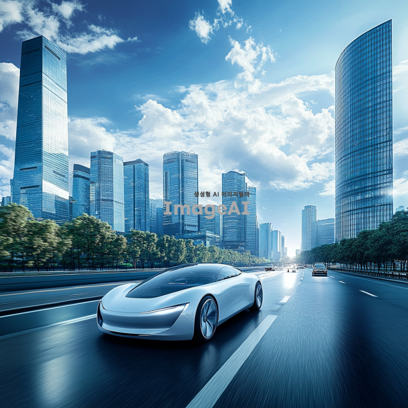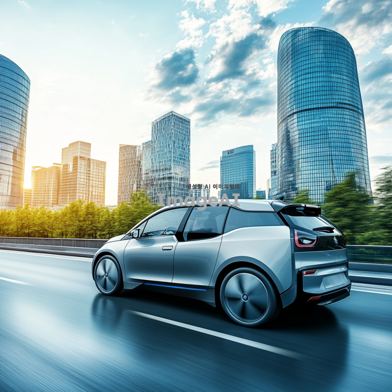 한국의 현대적인 도시 배경 속에서 세련된 디자인의 전기차가 도로를 달리고 있는 모습, 푸른 하늘과 구름이 어우러진 풍경, 주변에는 고층 빌딩과 나무들이 조화를 이루고 있는 장면. 차체의 반사광이 빛나는 모습과 함께, 도로 위의 차량들이 부드럽게 움직이는 역동적인 분위기.