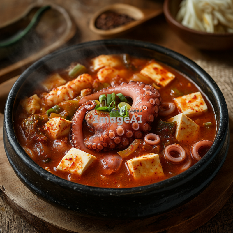 얼큰해장순두부찌개, 문어다리 1개가 중앙에 위치하여 강조된 모습, 고화질, 따뜻한 색감, 맛있어 보이는 재료들, 김이 모락모락 나는 찌개, 한국 전통 식기에서 제공되는 모습, 식욕을 자극하는 디테일