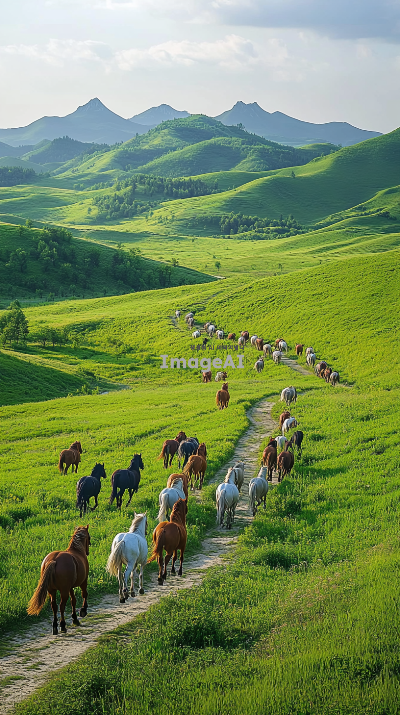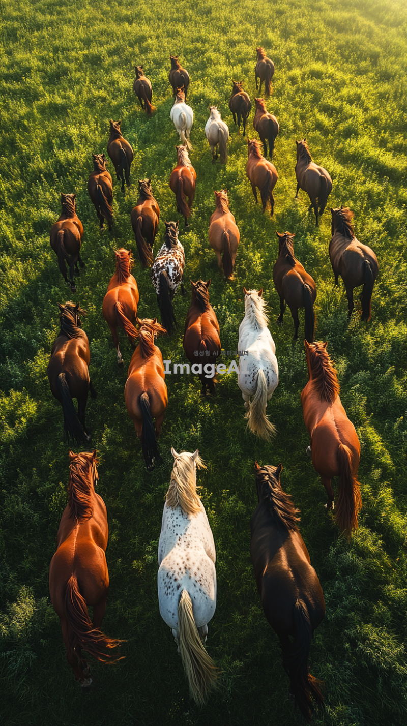 푸른 초원 위에서 다양한 색의 말들이 달리고 있는 모습을 하늘에서 바라본 장면. 초원의 푸른색과 말들의 다채로운 색상이 조화를 이루며, 넓은 하늘과 구름이 배경을 이루는 풍경. 자연의 아름다움과 자유로운 느낌이 잘 드러나는 이미지.