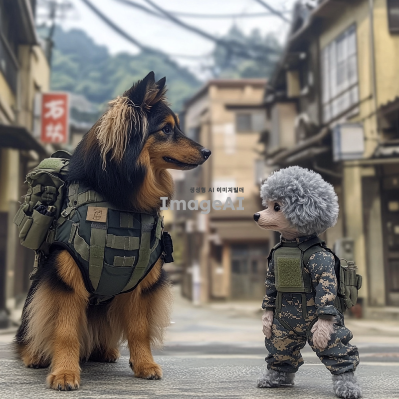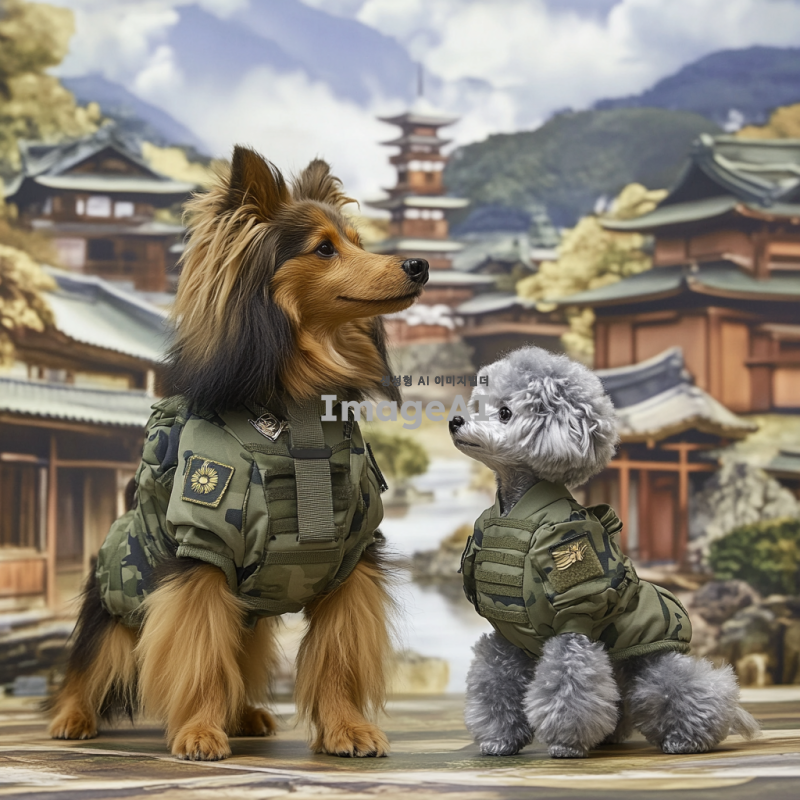 헉교를 배경으로 한 군견옷을 입고 있는 황토색과 검은색이 섞인 큰 셸티 강아지 한 마리와 군견옷을 입고 있는 작은 회색 실버푸들 한 마리가 함께 있는 장면. 배경은 헉교의 특징적인 건물과 자연경관이 어우러져 있고, 강아지들은 서로를 바라보며 친근하게 서 있다.