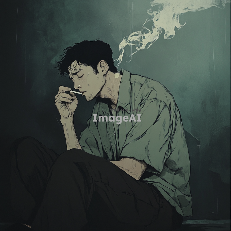 쭈구려 앉아 담배를 피우고 있는 한국 남성, 약간 잘생긴 외모, 간단한 카툰 스타일, 배경은 어주컴컴한 방, 캐주얼한 복장, 절망적이고 졸리고 피곤한 표정, 담배 연기가 퍼져나가는 모습.