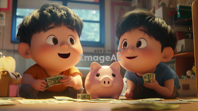 형과 동생이 각자의 방에 앉아 저금통을 앞에 두고 대화하는 장면. 형은 8000원, 동생은 2000원이 들어 있는 저금통을 바라보며 자신감 넘치는 표정으로 말하고 있다. 동생은 도전적인 표정으로 형을 바라보며 매일 500원씩 저금할 것이라고 결심한 모습. 방 안은 아늑하고 따뜻한 느낌으로, 저금통은 각각 다르게 디자인되어 있으며, 형의 저금통은 크고 화려한 반면 동생의 저금통은 작고 귀여운 디자인이다. 다음 날 아침, 형과 동생이 저금통에 돈을 넣는 장면. 두 사람은 서로를 바라보며 웃고 있고, 저금통에는 각각의 돈이 들어가고 있는 모습이 보인다. 방 안은 밝고 상쾌한 아침 햇살이 들어오며, 두 사람의 우정이 느껴지는 따뜻한 분위기로 표현된다.