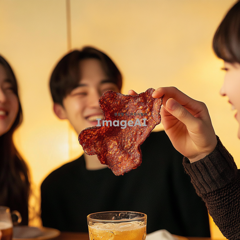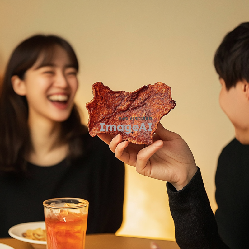 친구들과 함께 비프칩을 먹으며 즐거운 시간을 보내고 있는 성인들, 다양한 표정과 포즈로 웃고 있는 모습, 아늑한 분위기의 카페나 집 안, 테이블 위에 비프칩과 음료가 놓여 있는 장면, 따뜻한 조명 아래에서의 친목 모임, 한국적인 요소가 가미된 스타일.