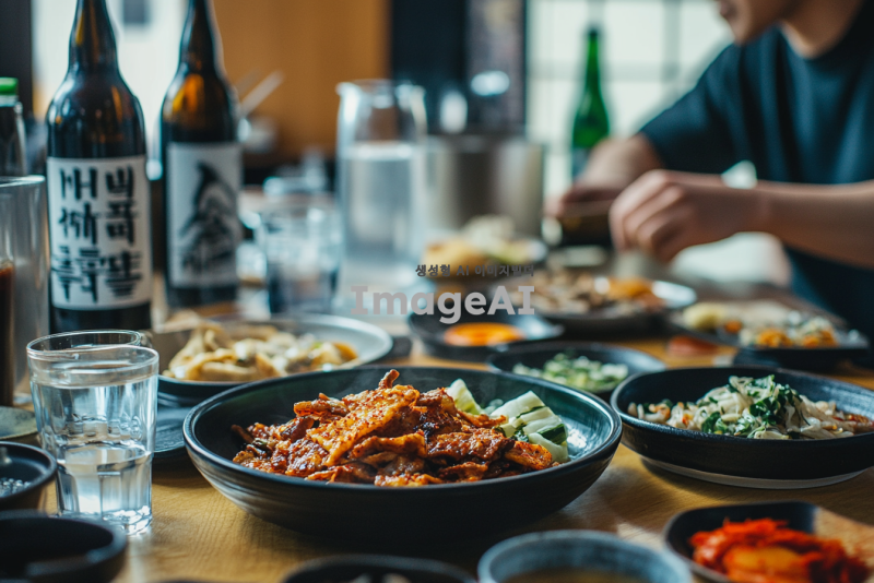 한국인 남성이 소고기칩을 즐기며 친구들과 함께 술안주로 나누는 장면. 따뜻한 조명 아래, 맛있게 구운 소고기칩이 담긴 접시와 함께 유쾌한 대화가 오가는 분위기. 배경에는 한국의 전통적인 소주병과 잔이 놓여있고, 테이블 위에는 다양한 안주가 함께 배열되어 있는 모습.