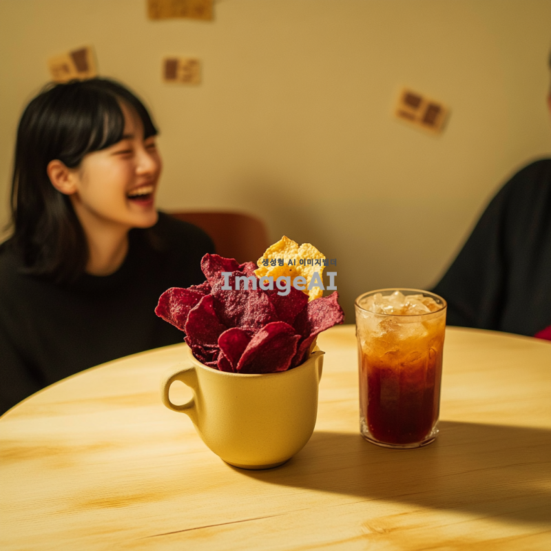 한국의 아늑한 카페에서 비프칩을 함께 나누며 웃고 있는 친구들, 다양한 표정과 포즈로 즐거운 시간을 보내고 있는 모습, 테이블 위에는 비프칩과 음료가 놓여 있고, 배경에는 따뜻한 조명이 비추는 아기자기한 인테리어, 한국의 전통적인 요소가 살짝 가미된 공간.