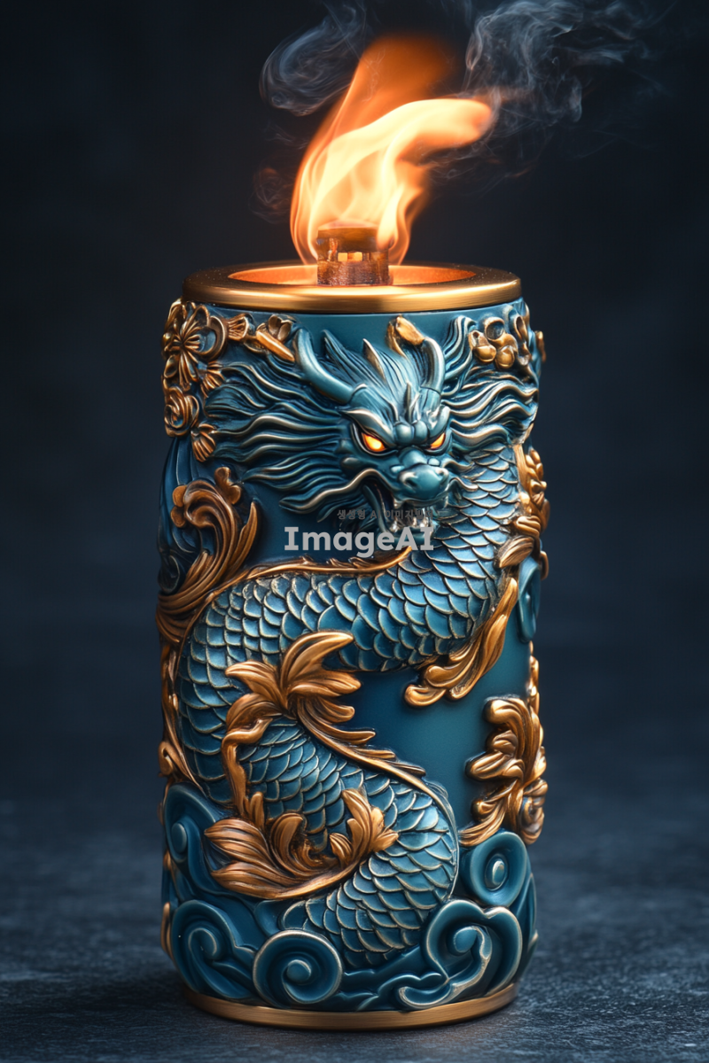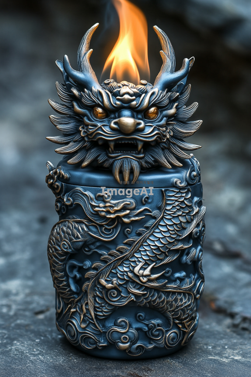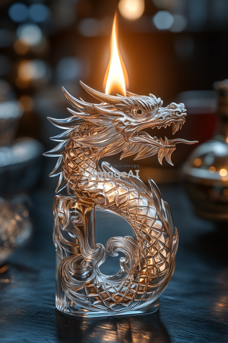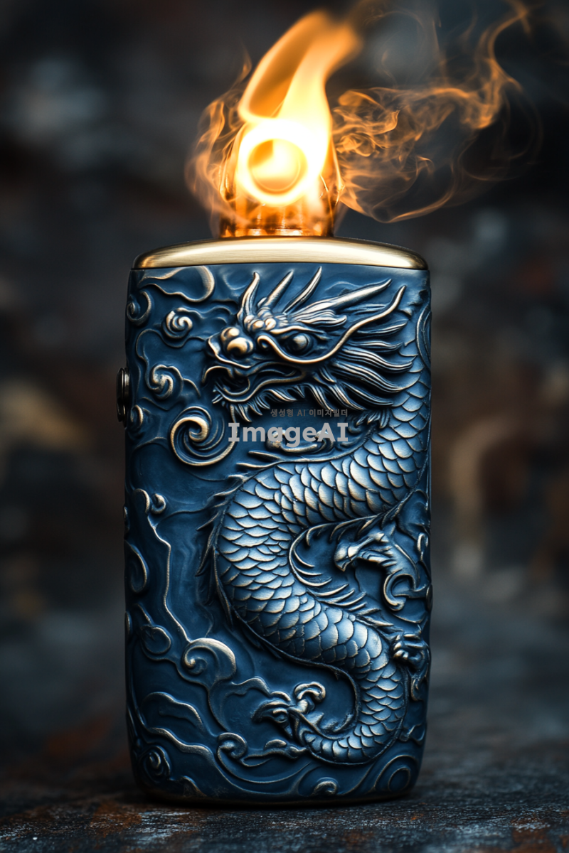 드래곤 형태의 라이터 디자인, 강렬한 불꽃을 내뿜는 모습, 세밀한 비늘과 날개, 고전적인 판타지 스타일, 금속과 유리 재질의 조화, 어두운 배경에서 빛나는 라이터의 불꽃, 신비로운 분위기, 한국 전통 문양이 새겨진 장식 요소 추가