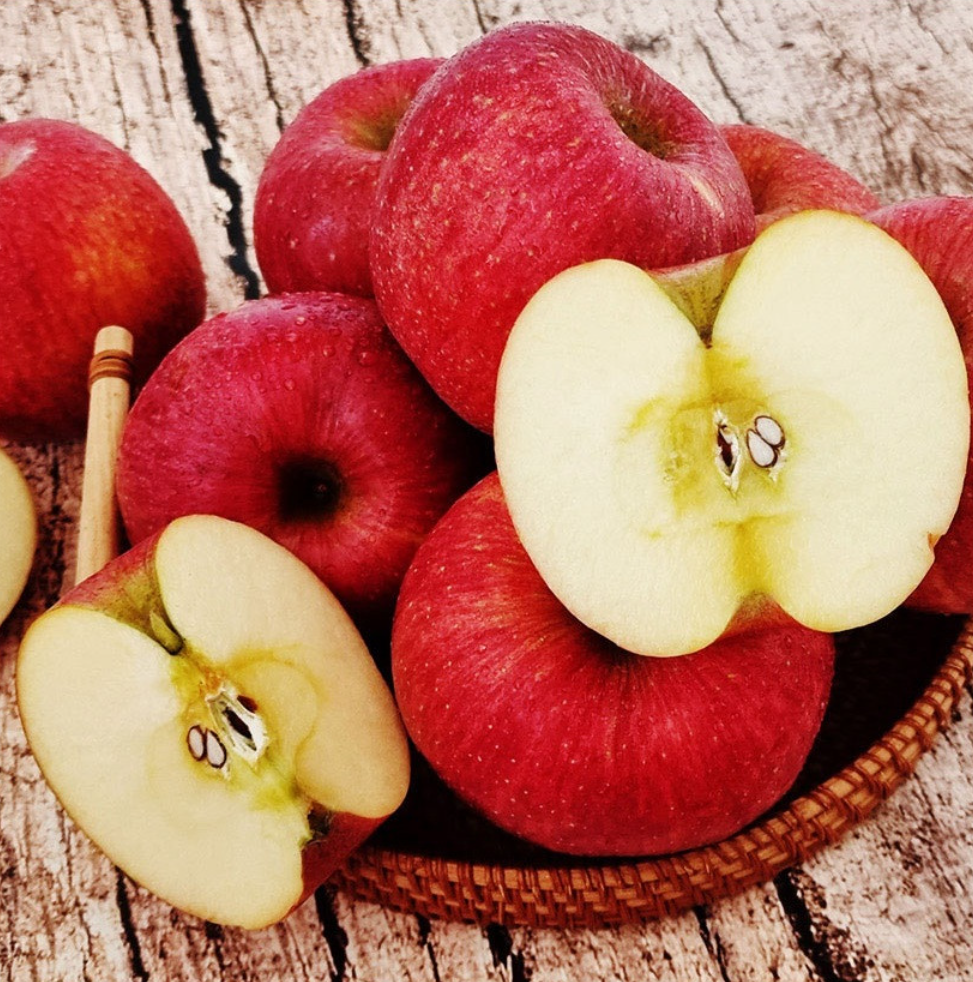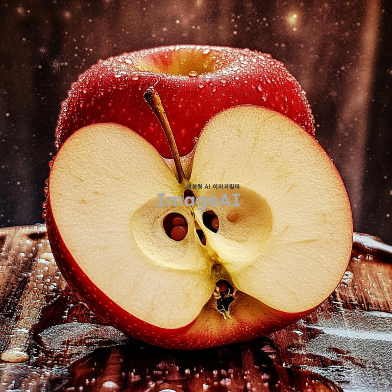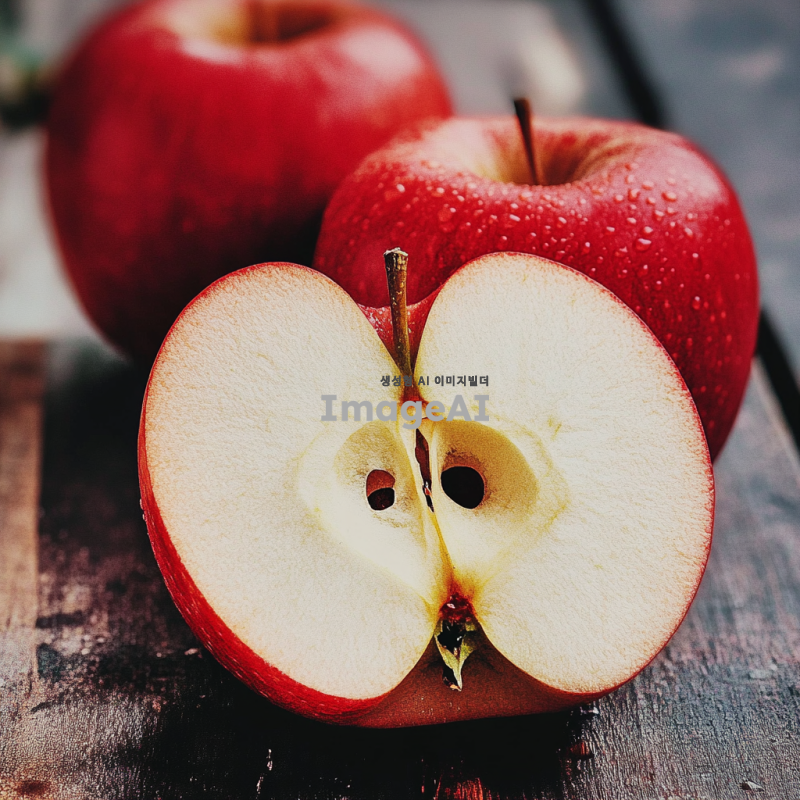 맛있어 보이는 반으로 쪼갠 사과, 신선한 사과의 붉은 색과 생생한 질감, 반으로 나누어진 사과의 내부가 드러나고, 반짝이는 물방울이 맺힌 모습, 자연광 아래에서 촬영된 느낌, 식욕을 자극하는 이미지