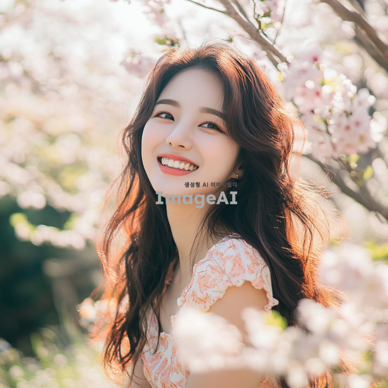 밝은 햇살 아래 공원에서 웃고 있는 한국인 여성, 긴 머리를 가진, 화사한 원피스를 입고, 주변에 꽃들이 만발한 모습, 자연스러운 표정과 따뜻한 분위기, 행복한 순간을 담은 이미지