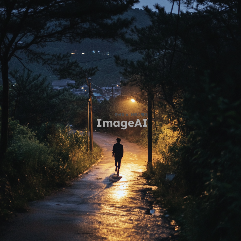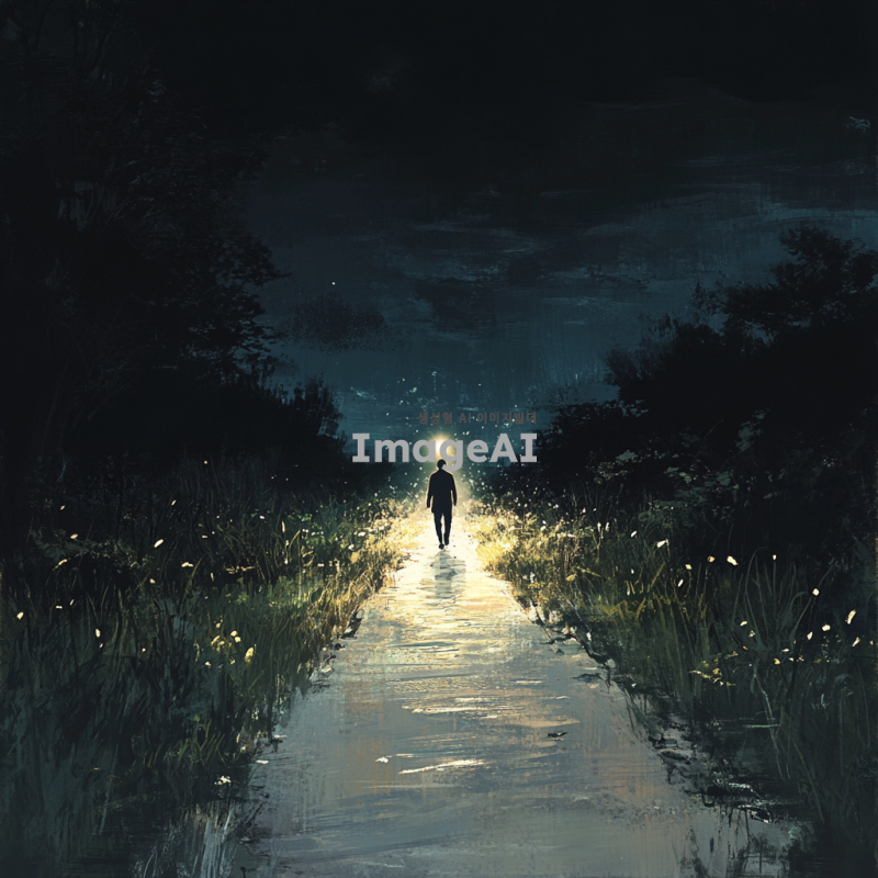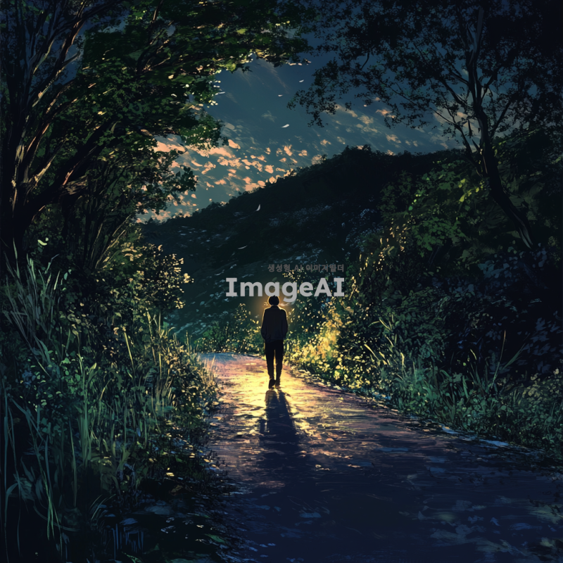 길 끝에서 밝은 빛이 비추고 있는 장면, 한 한국인이 그 빛을 향해 걸어가는 모습. 주변은 어두운 분위기지만, 빛나는 곳은 따뜻하고 희망적인 느낌을 주며, 사람의 표정은 결단력과 희망으로 가득 차 있다. 길은 자연으로 둘러싸여 있으며, 나무와 풀들이 빛을 반사하여 아름다운 풍경을 연출하고 있다.