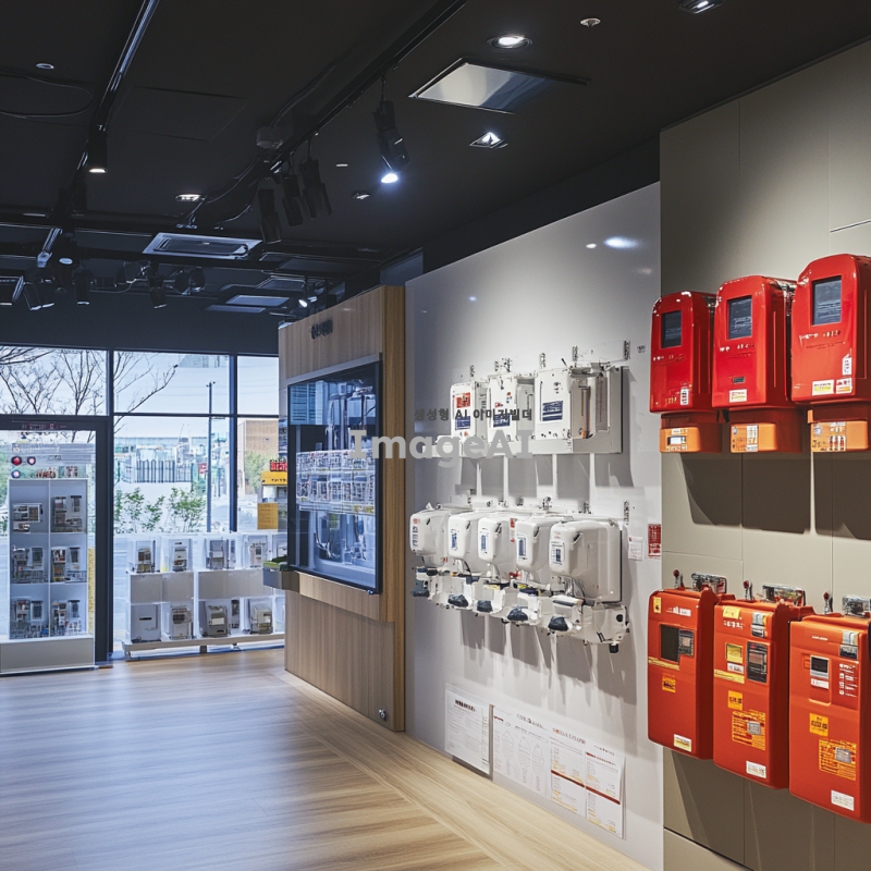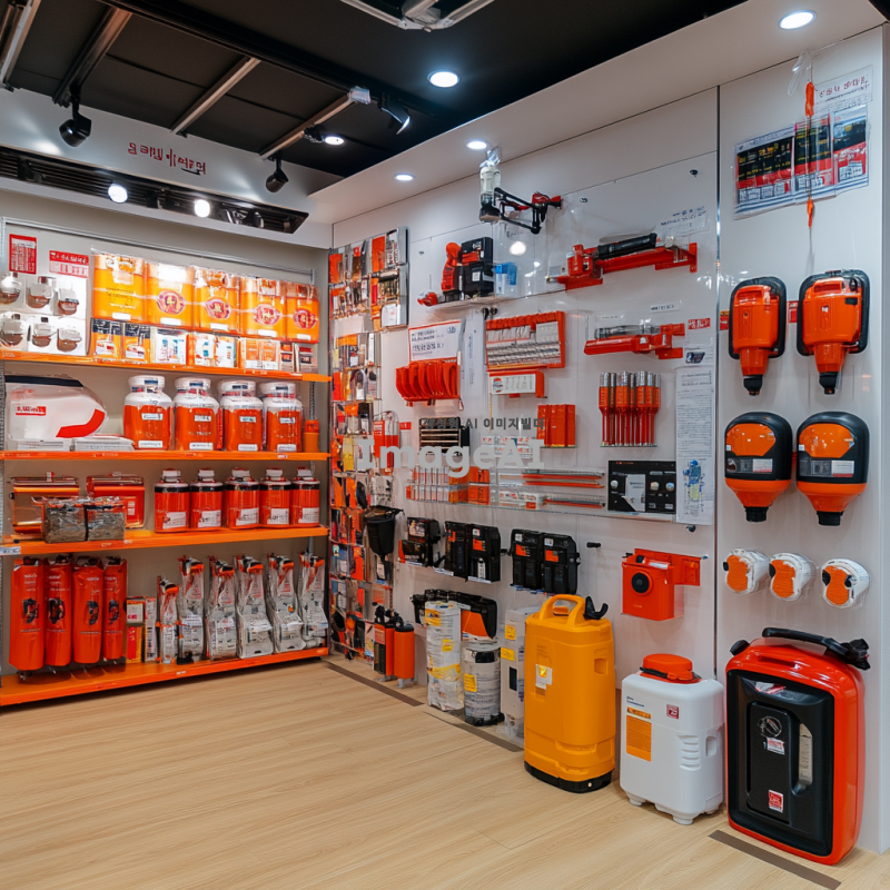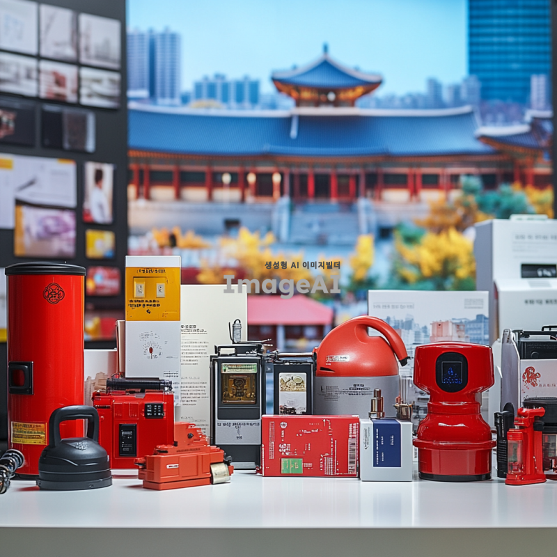 소방 및 방재 전문 기업인 주식회사 창성에이스산업의 다양한 제품들을 배경으로 한 이미지. 반도체 장비용 자동 소화 시스템, 불꽃 감지기, 열영상 화재감지카메라, 주방용 소화기 등 여러 제품이 조화롭게 배열되어 있는 모습. 예술의 전당, 흥인지문, 불국사와 같은 주요 시설의 실내 또는 외부 환경을 배경으로 하여, 제품들이 실제로 설치된 듯한 느낌을 주는 장면. 한국인 엔지니어가 제품을 점검하거나 설명하는 모습이 포함되어 있으며, 안전하고 신뢰감 있는 분위기를 강조.