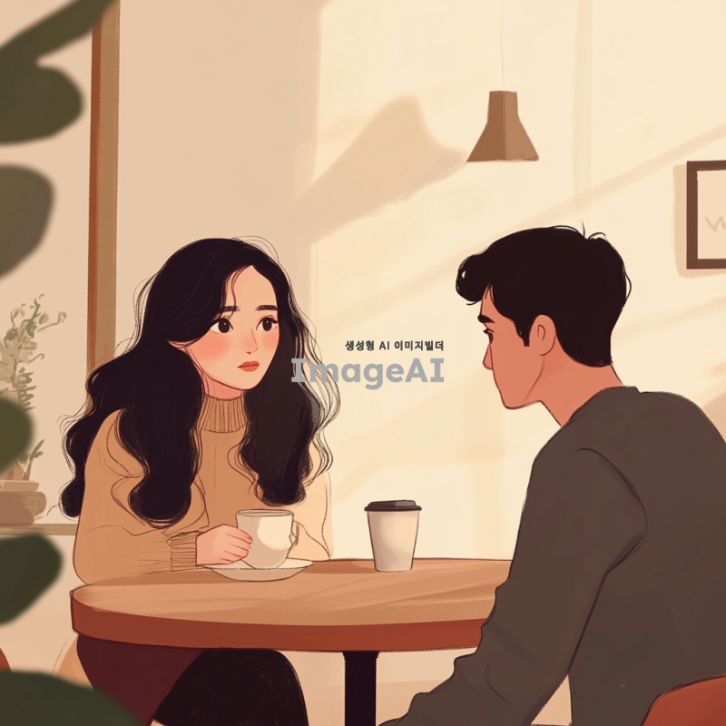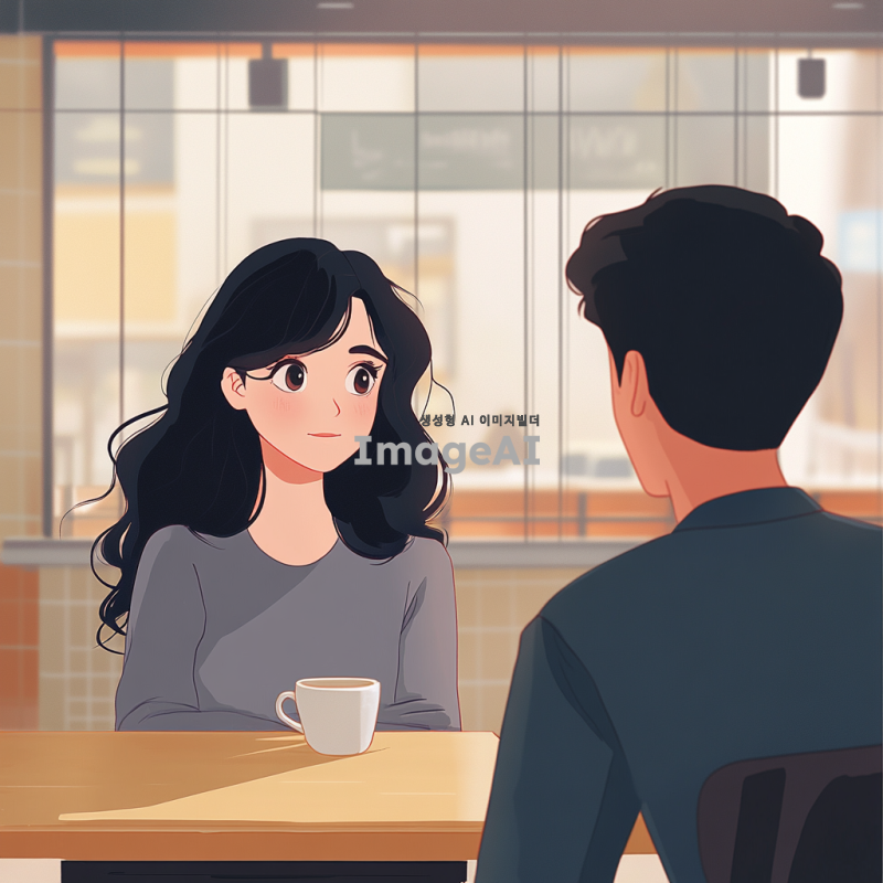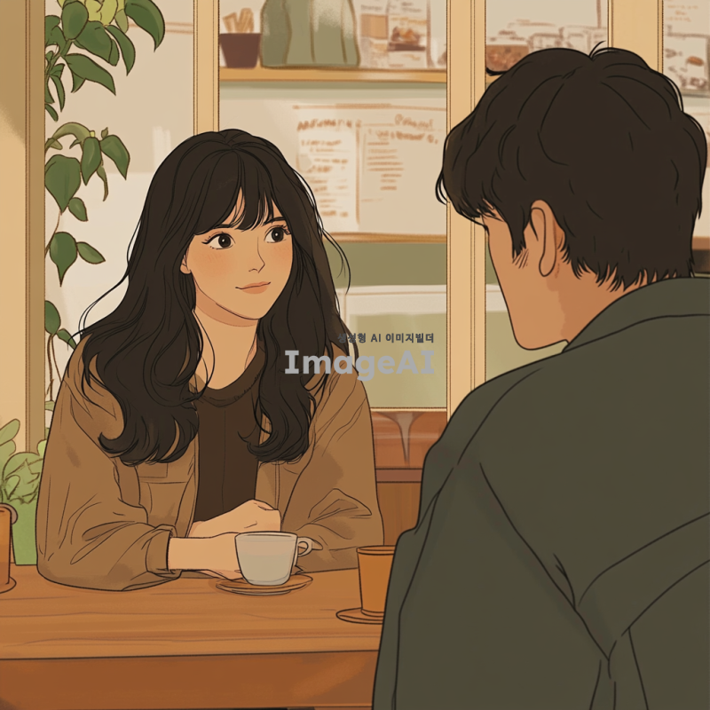 검은 물결 머리를 가진 여성 캐릭터가 커피숍의 테이블에 앉아 남성 캐릭터와 만나는 모습을 담은 만화 스타일의 애니메이션 일러스트. 배경은 최대한 차분하게 표현하여 전체적인 분위기를 부드럽고 아늑하게 연출.