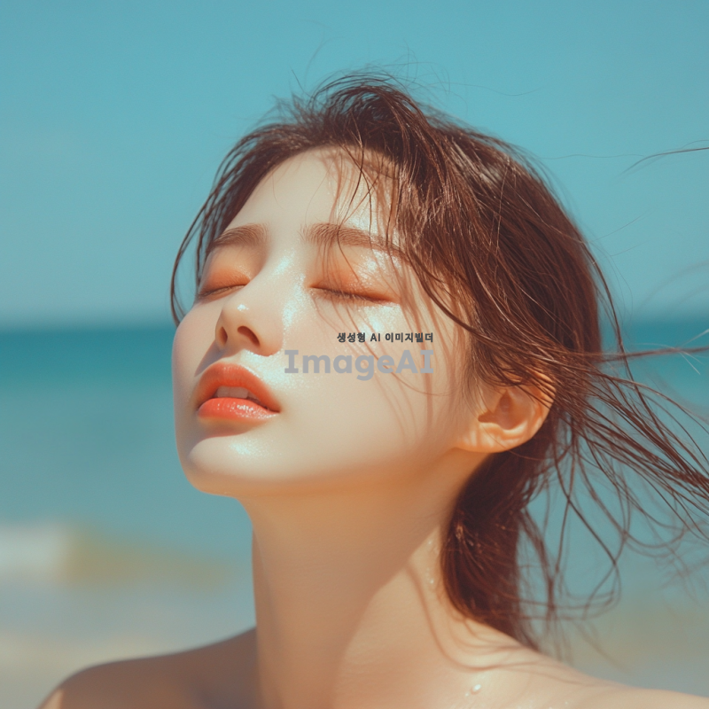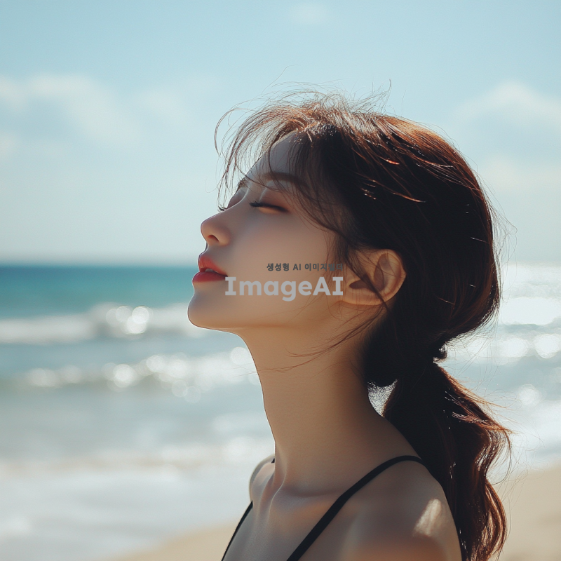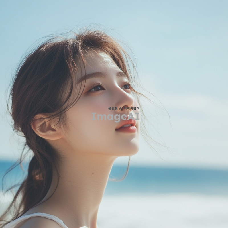 대한민국 출신 여성, 자연스러운 표정, 해변에서 여유롭게 시간을 보내는 모습, 부드러운 머리카락, 따뜻한 햇살 아래에서 빛나는 피부, 배경은 푸른 바다와 하늘, 여름의 기분을 느낄 수 있는 장면