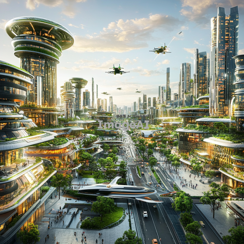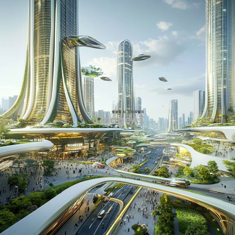 미래의 세계도시 풍경, 첨단 기술이 적용된 스마트 시티, 공중에 떠 있는 교통 수단과 녹지 공간이 조화롭게 어우러진 모습, 고층 빌딩과 자연이 공존하는 환경, 다양한 문화와 사람들이 함께하는 활기찬 거리 풍경, 미래적이고 혁신적인 건축물과 조명, 맑은 하늘과 푸른 공원, 미래 지향적인 디자인 요소가 가미된 도시 전경.