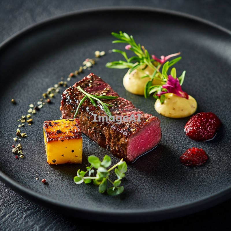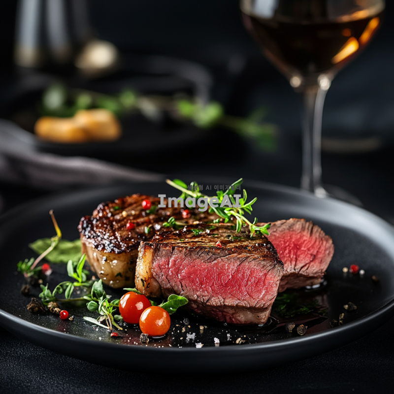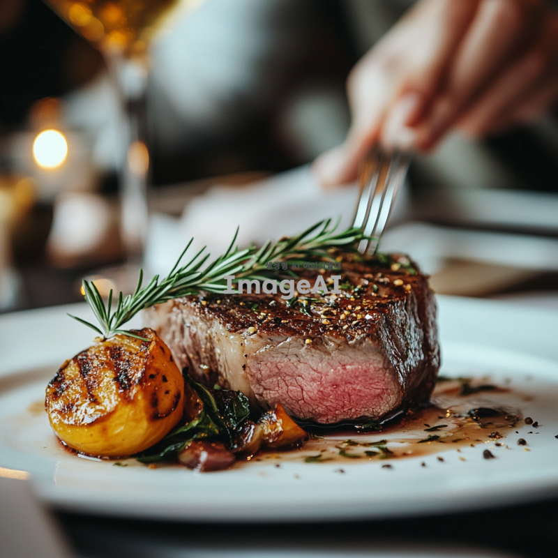 부드럽고 육즙이 가득한 소고기 안심 스테이크, 겉은 바삭하게 구워지고 속은 핑크색으로 완벽하게 익힌 모습, 신선한 허브와 함께 플레이팅된 고급스러운 요리, 고급 레스토랑의 분위기, 세련된 접시와 함께 제공되는 모습, 따뜻한 조명 아래에서의 식사 장면.