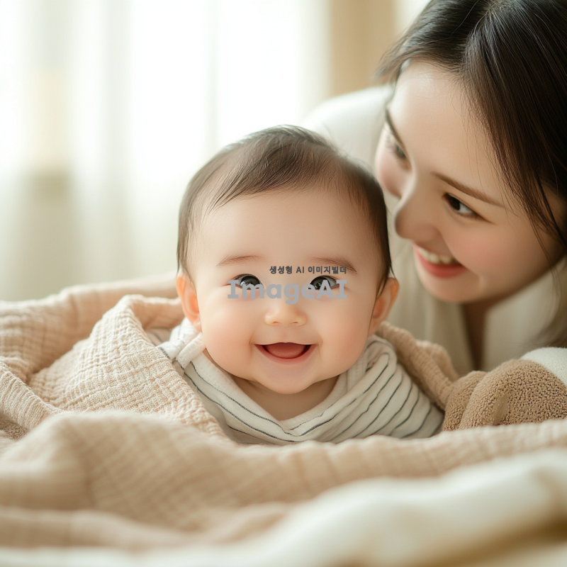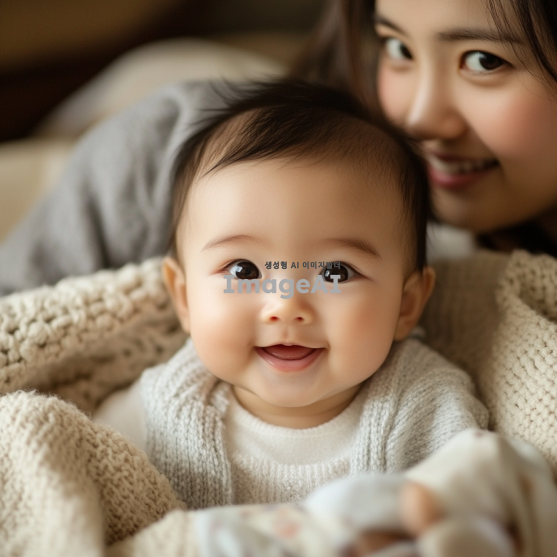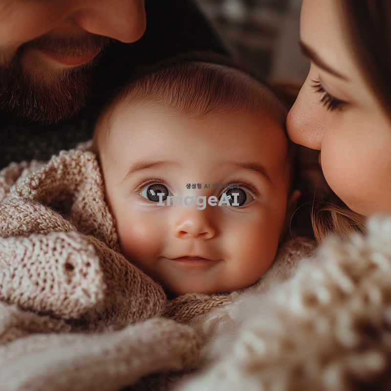 아기와 함께하는 따뜻한 가족의 순간, 아기가 웃고 있는 모습, 아기의 순수한 표정과 큰 눈, 부드러운 아기 피부, 아기용 의상, 자연광이 비치는 아늑한 실내 배경, 사랑스러운 분위기, 행복한 표정의 부모와 아기, 포근한 담요에 감싸인 아기, 소품으로 아기 장난감이나 인형이 있는 장면.