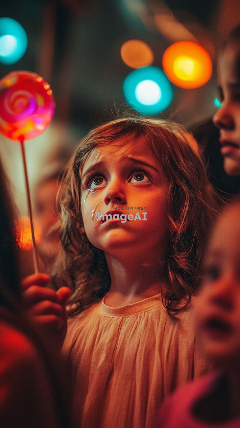 어린아이가 막대사탕을 들고 두 눈에 눈물을 글썽이며 겁에 질린 모습, 주변에는 친구들이 장난스럽게 다가오는 모습, 아동용 밝은 색상의 배경, 감정이 잘 드러나는 얼굴 표정, 따뜻하고 아기자기한 분위기