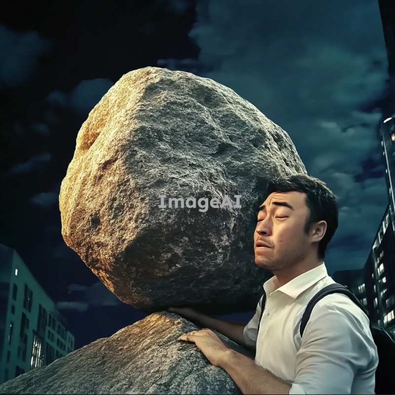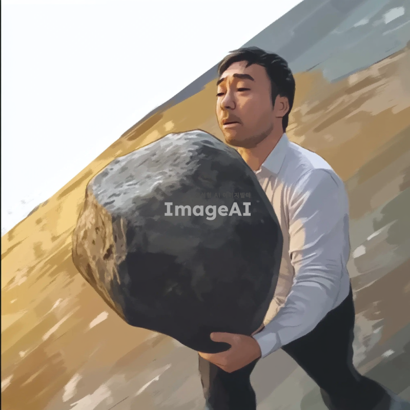 큰 바위를 언덕 위로 밀어 올리는 사람, 무게와 싸우며 이마에 땀이 번들거리는 이미지 만들어줘