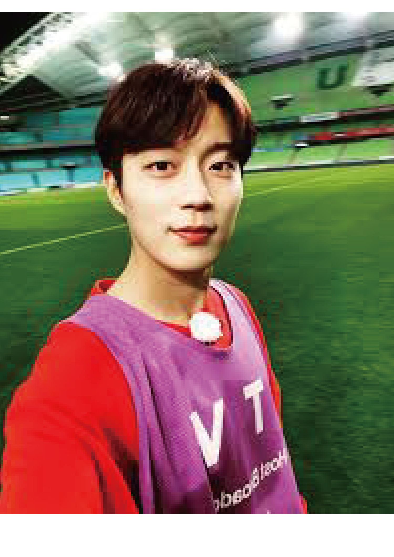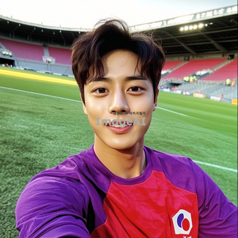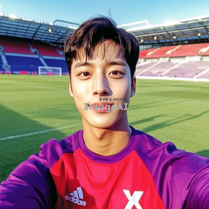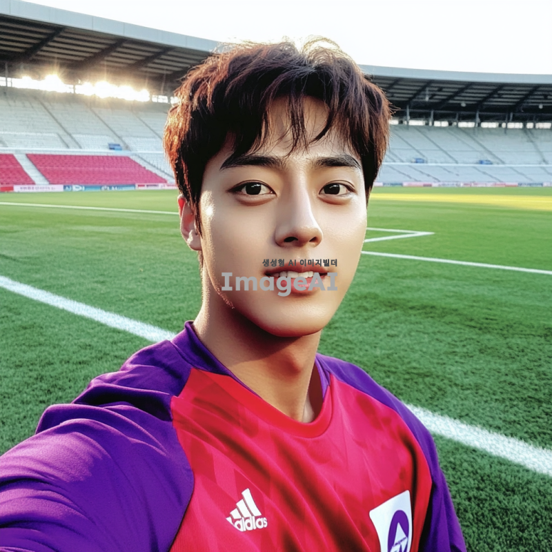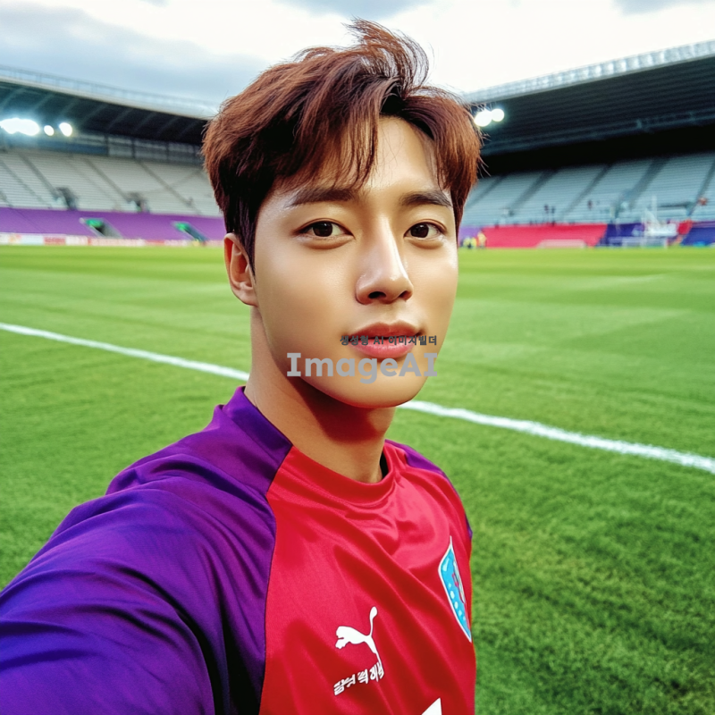 젊은 한국 남성이 짧은 머리를 하고 빨간색과 보라색 축구 장비를 입고 축구 필드와 경기장 잔디 앞에서 인스타그램 셀피를 찍고 있다. 배경에는 비어 있는 관중석의 일부가 보인다.