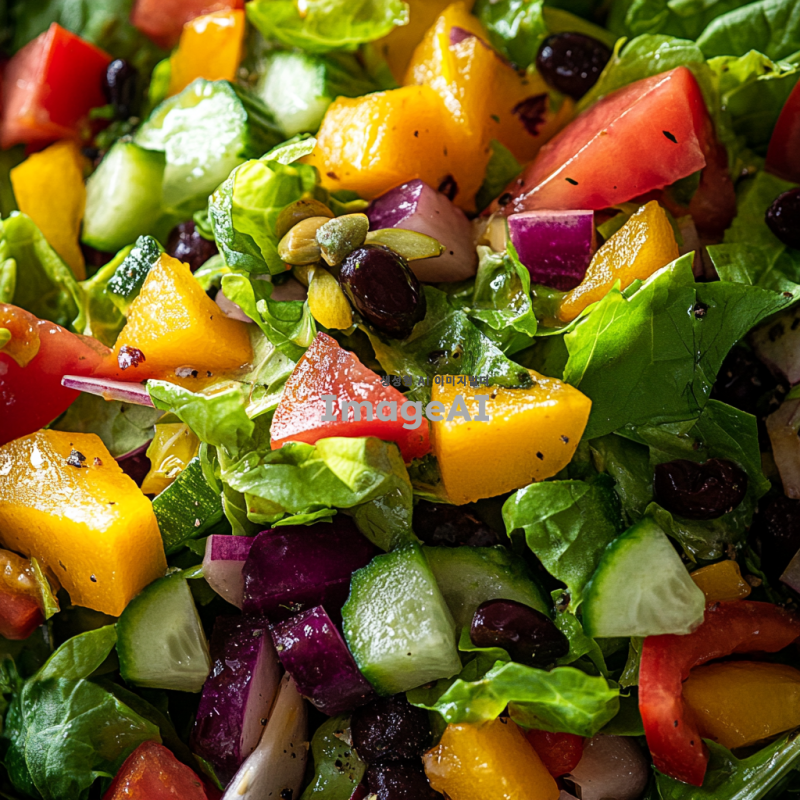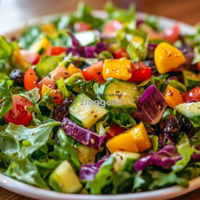 신선한 채소와 과일이 가득 담긴 싱그러운 샐러드, 다양한 색상의 채소가 어우러져 있는 모습, 아삭한 식감이 느껴지는 상큼한 드레싱이 뿌려진, 자연광 아래에서 촬영된, 건강하고 맛있어 보이는 느낌