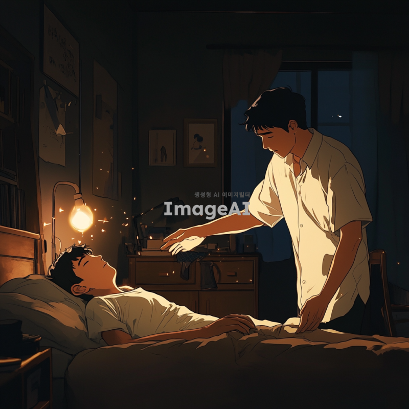 한적한 방 안, 누워 있는 소년 위로 다가오는 남자의 모습. 남자는 짧은 머리를 가진 한국인으로, 소년을 보호하려는 듯한 표정. 방 안은 따뜻한 조명이 비추고, 소년은 편안한 표정으로 누워 있음. 남자는 소년에게 다가가며 손을 내밀고, 두 사람 사이에는 신뢰와 우정이 느껴지는 분위기.