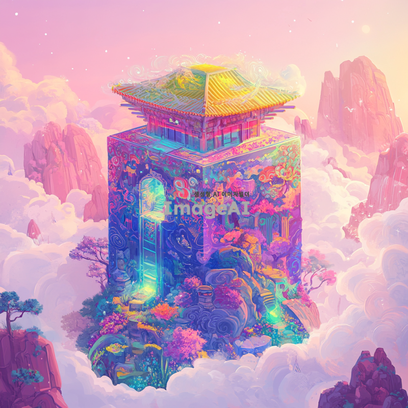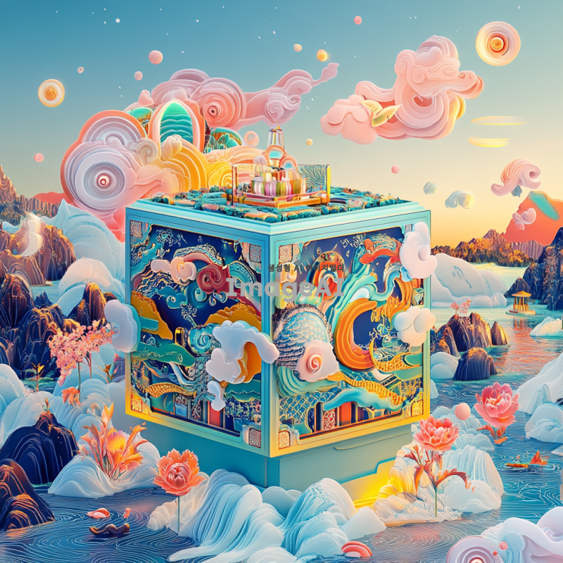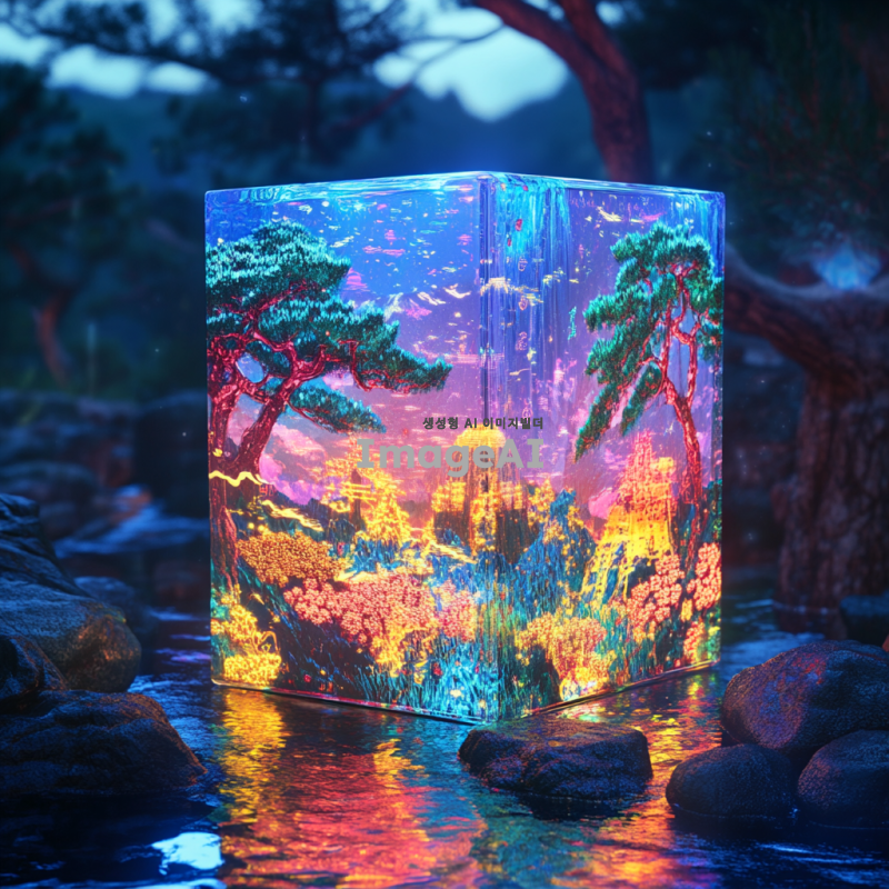 정육면체 형태의 도깨비방망이를 디자인한 이미지, 한국 전통 문화의 요소를 포함하여 화려한 색상과 독특한 패턴을 강조, 배경은 몽환적인 느낌의 자연 풍경으로 설정, 도깨비방망이는 빛나는 효과를 주어 마법적인 느낌을 추가.
