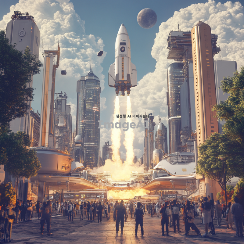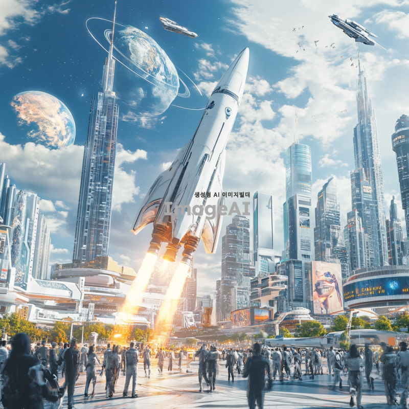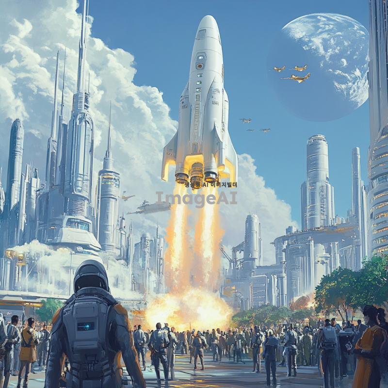 우주기업의 발전으로 인해 변화하는 일상 생활을 주제로 한 이미지. 현대적인 도시 풍경 속에 우주선이 이착륙하는 모습, 사람들은 우주 여행을 준비하며 신기한 기술을 사용하고 있는 장면. 다양한 인종의 사람들이 함께 모여 우주 관련 이벤트에 참여하고, 우주 기업의 로고가 보이는 배경. 미래적이고 혁신적인 분위기를 강조하며, 우주와 관련된 다양한 요소들이 조화를 이루는 모습.