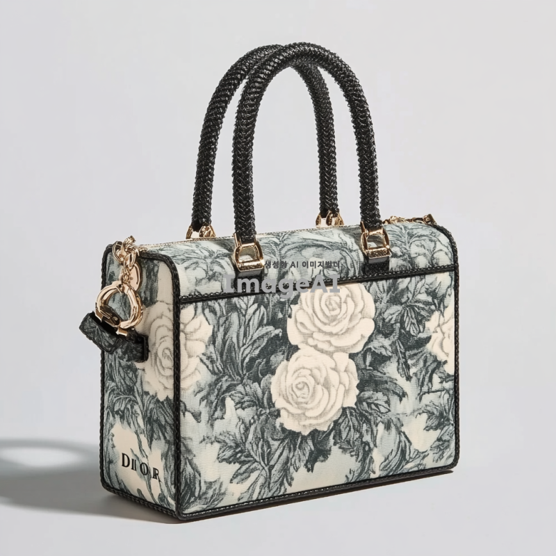 디올의 토일 드 주이 패턴을 배경으로 하고, 샤넬의 검정 테두리가 있는 흰색 장미가 장식된 봄 분위기의 가방 디자인. 가방의 형태는 디올의 북 토트 스타일로, 우아하고 세련된 느낌을 강조하며, 전체적으로 화사한 봄의 느낌을 담아낸다.