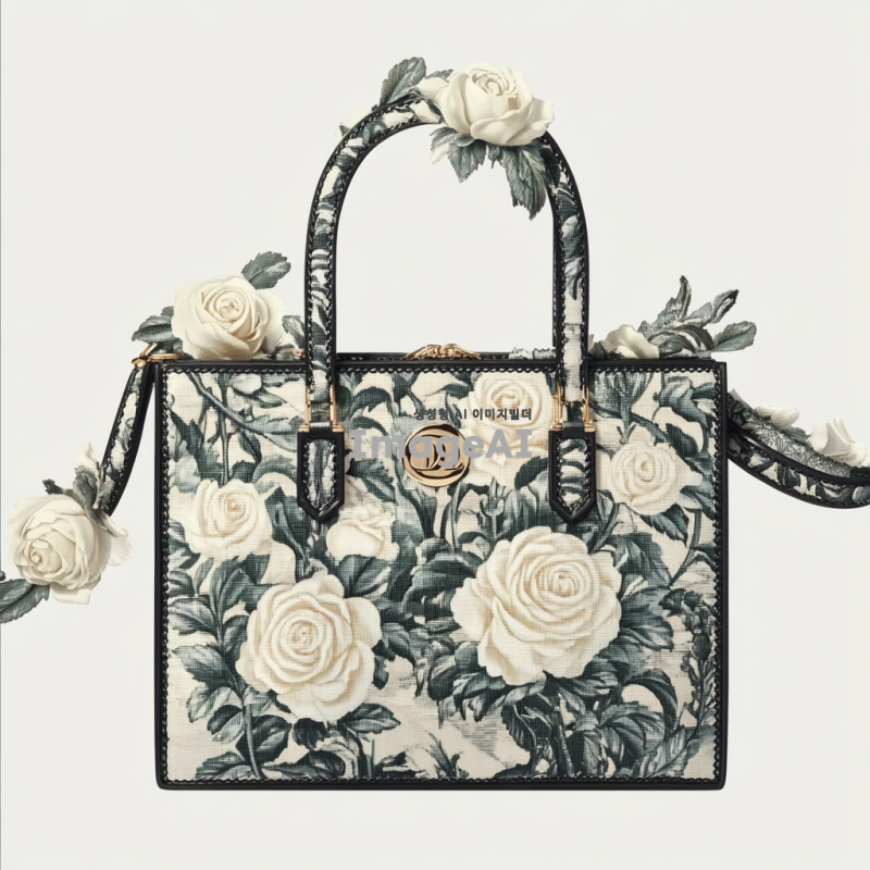 디올과 샤넬이 협업하여 만든 가방 디자인을 만들거야. 디올의 토일 드 주이 패턴을 사용하고 샤넬의 테두리가 검정인 흰색 장미를 사용해서 봄의 분위기를 보여주는 가방을 제작 할거야. 가방의 원형은 디올의 북 토트로 해야해.